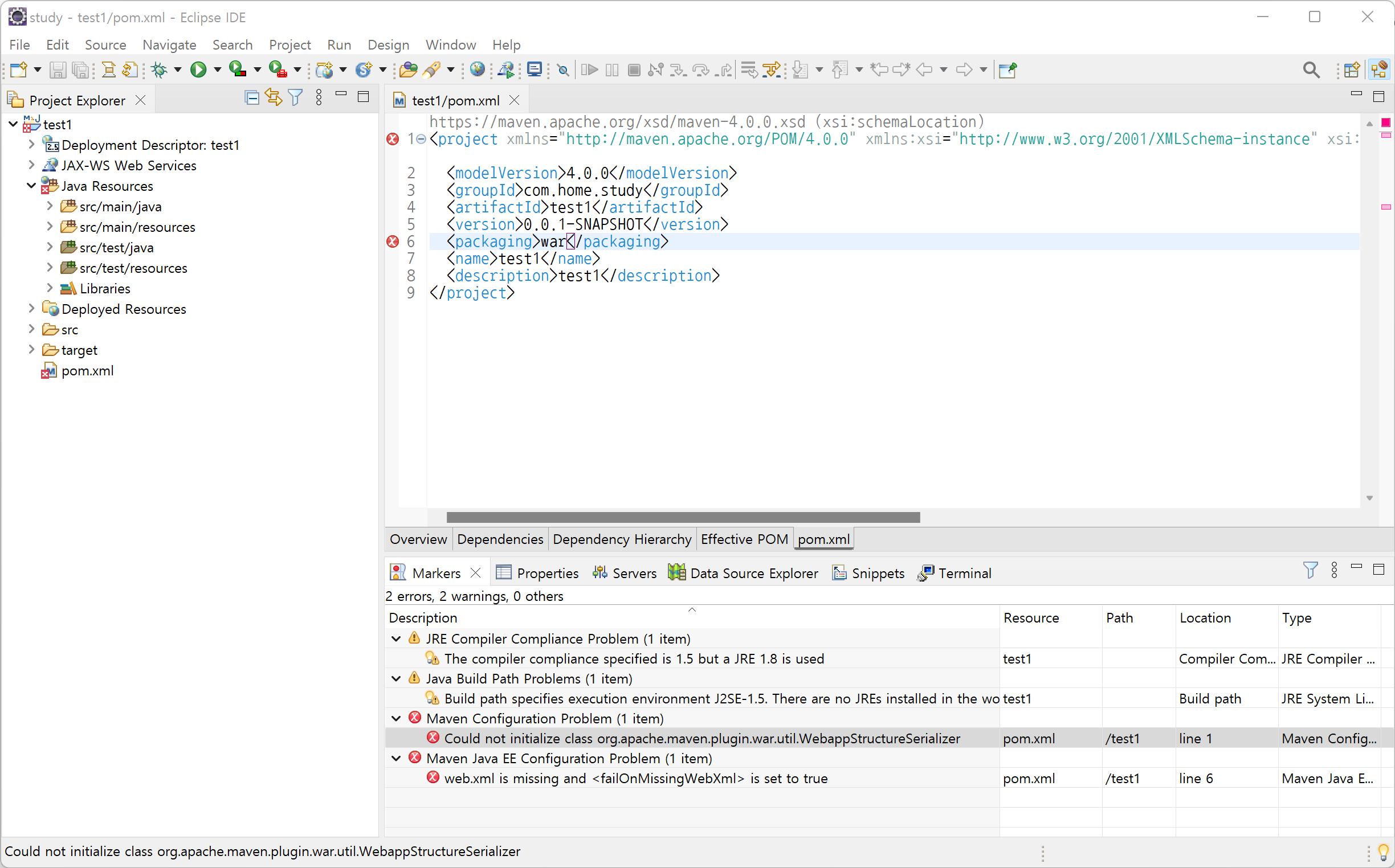 1. 이클립스 버전에 따라 maven-war-plugin의 버전이 너무 낮으면 pom.xml에서 org.apache.maven.plugin.war.util.WebappStructureSerializer 클래스를 초기화할 수 없다는 오류가 발생합니다.