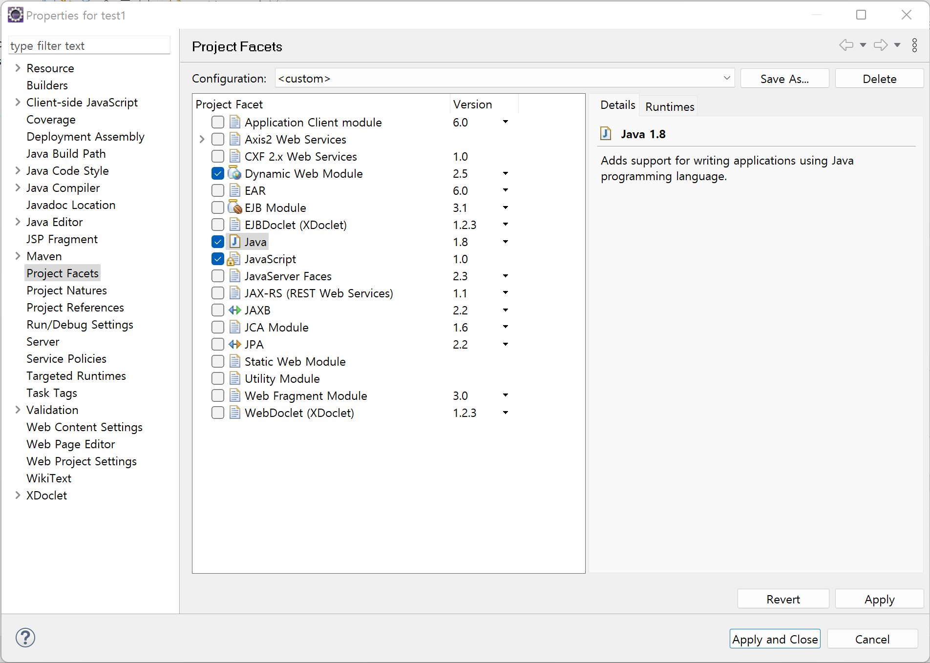 이럴 때는 Project Facets에서 Java의 Version를 1.5에서 1.8로 변경하고 적용을 위해 Apply 버튼을 클릭합니다.