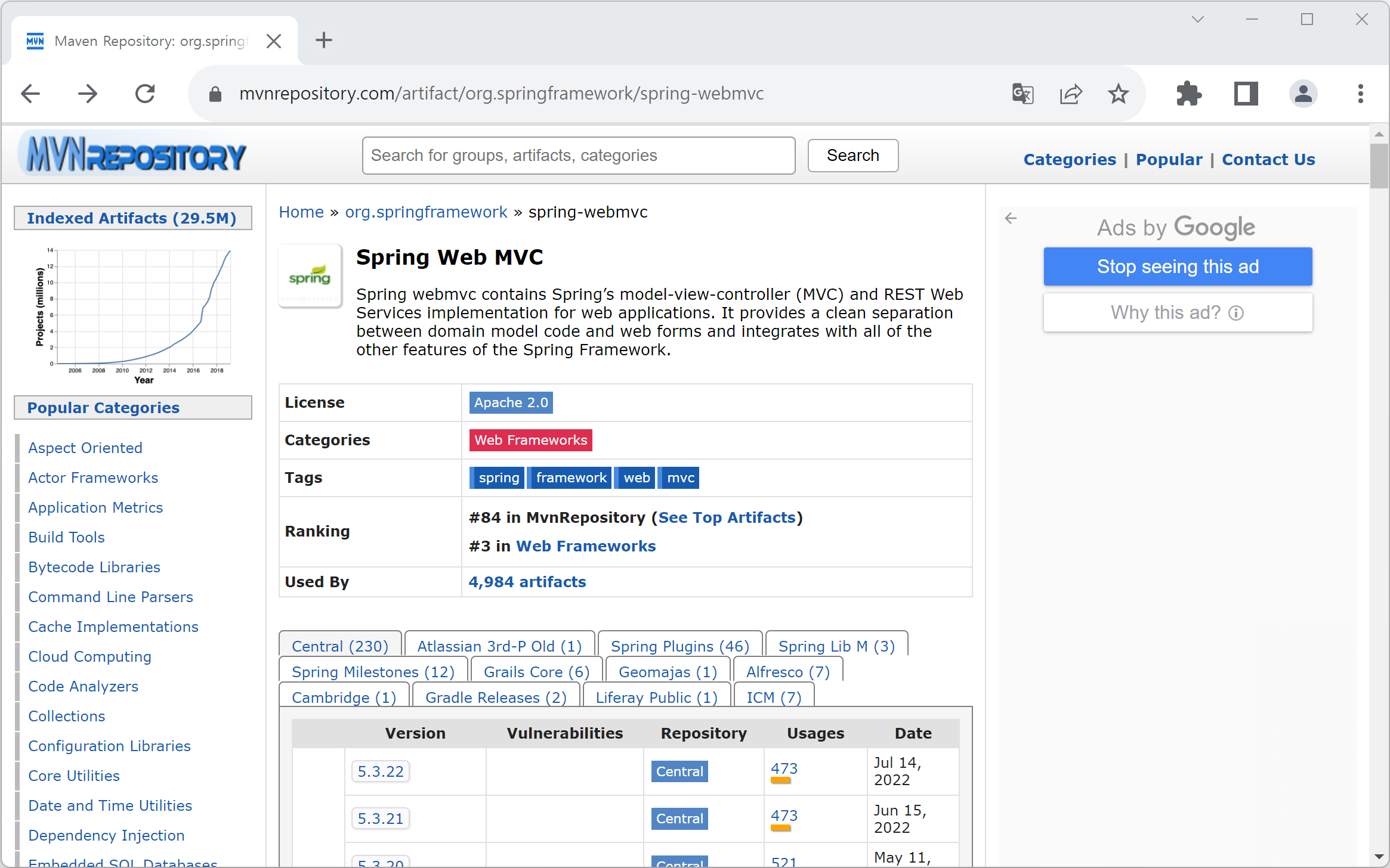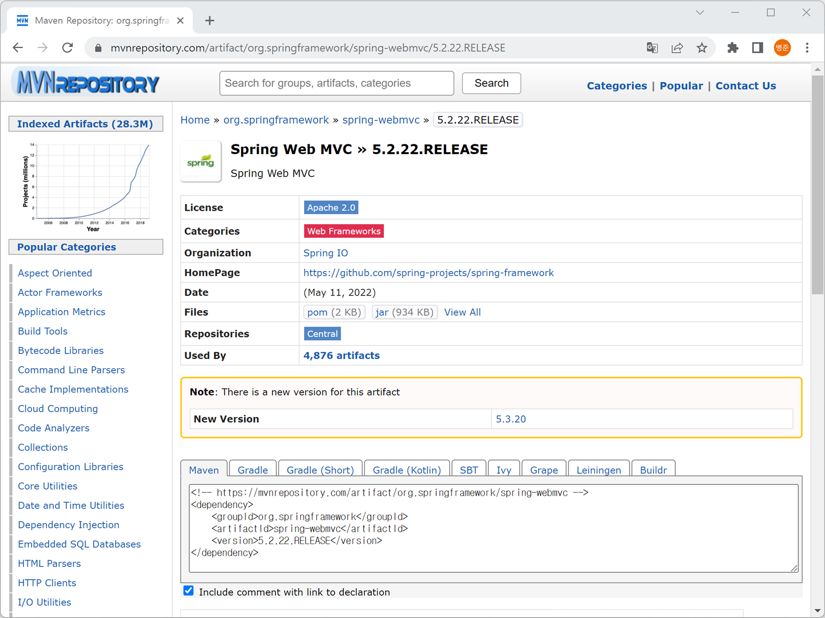 1. 메이븐 리포지토리(https://mvnrepository.com)에서 "spring-webmvc"으로 검색합니다.