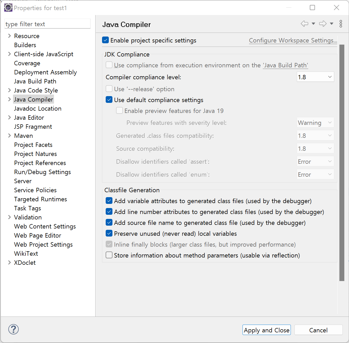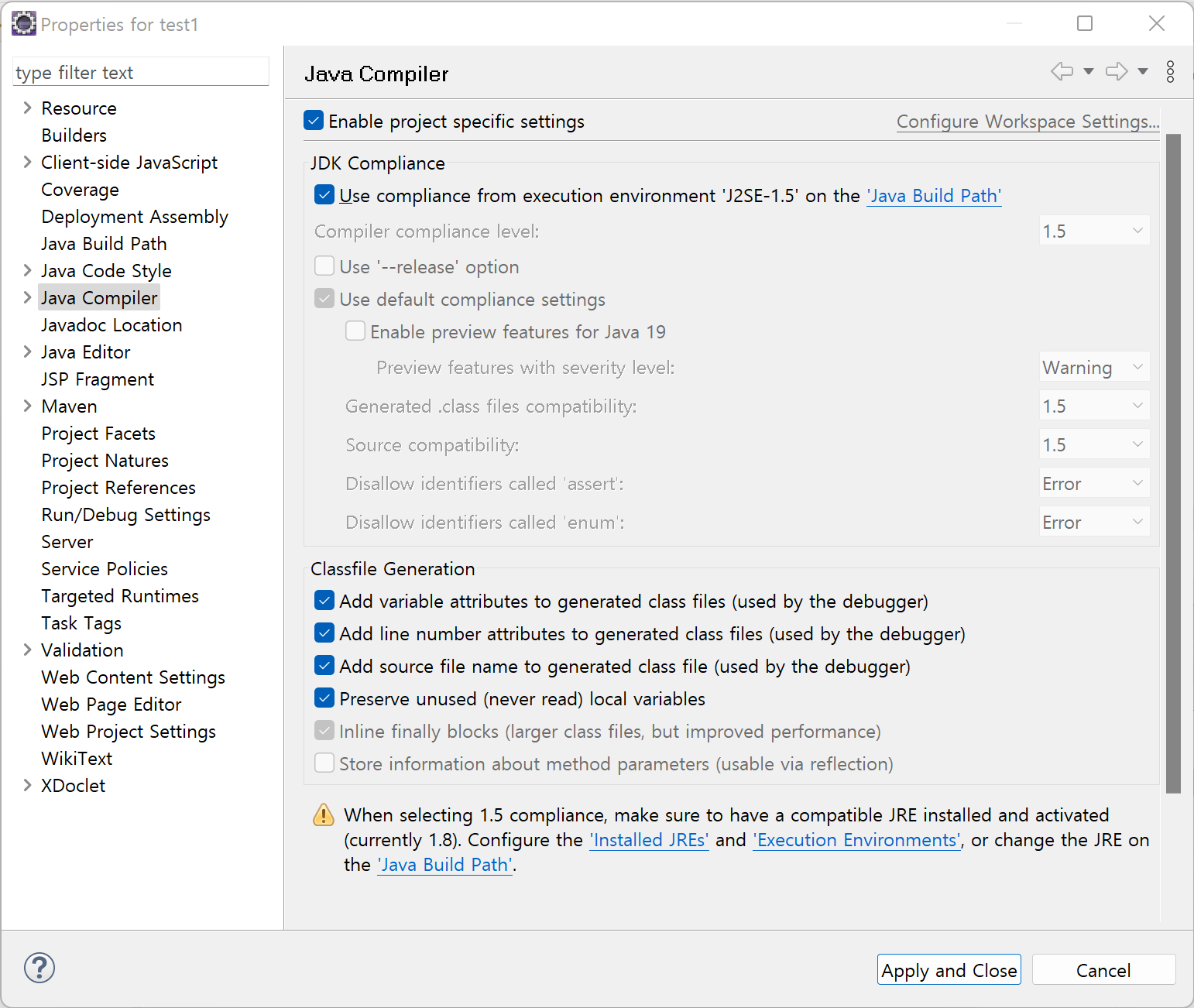 "Project Explorer"의 "test1"에서 오른쪽 버튼을 클릭하여 콘텍스트 메뉴에서 [Project > Properties]를 클릭하고 Java Compiler를 선택해보면 Compiler compliance level이 1.5인걸 확인할 수 있습니다. 하단 메시지에도 Compiler compliance level(1.5)이 설치된 JRE(1.8)과 맞지 않는다고 알려줍니다.