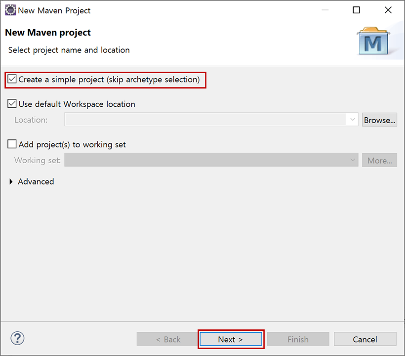 2. "New Maven Project"창에서 "Create a simple project (skip archetype selection)"를 체크하고 "Next >"버튼을 클릭합니다.