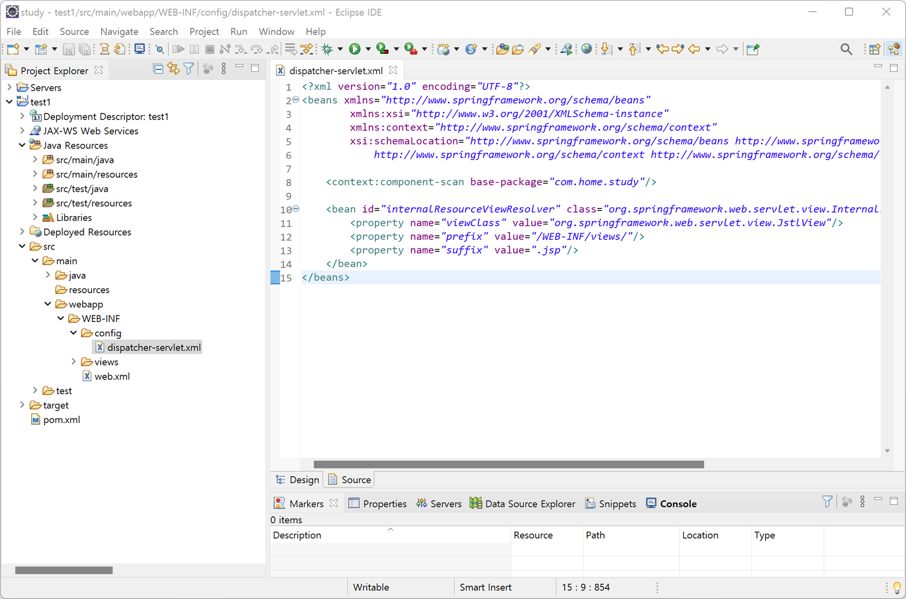 7. WEB-INF/config 폴더에서 dispatcher-servlet.xml 파일 오픈합니다. JSTL를 적용하기 위해서 ViewResolver의 viewClass에 org.springframework.web.servlet.view.JstlView를 입력합니다.