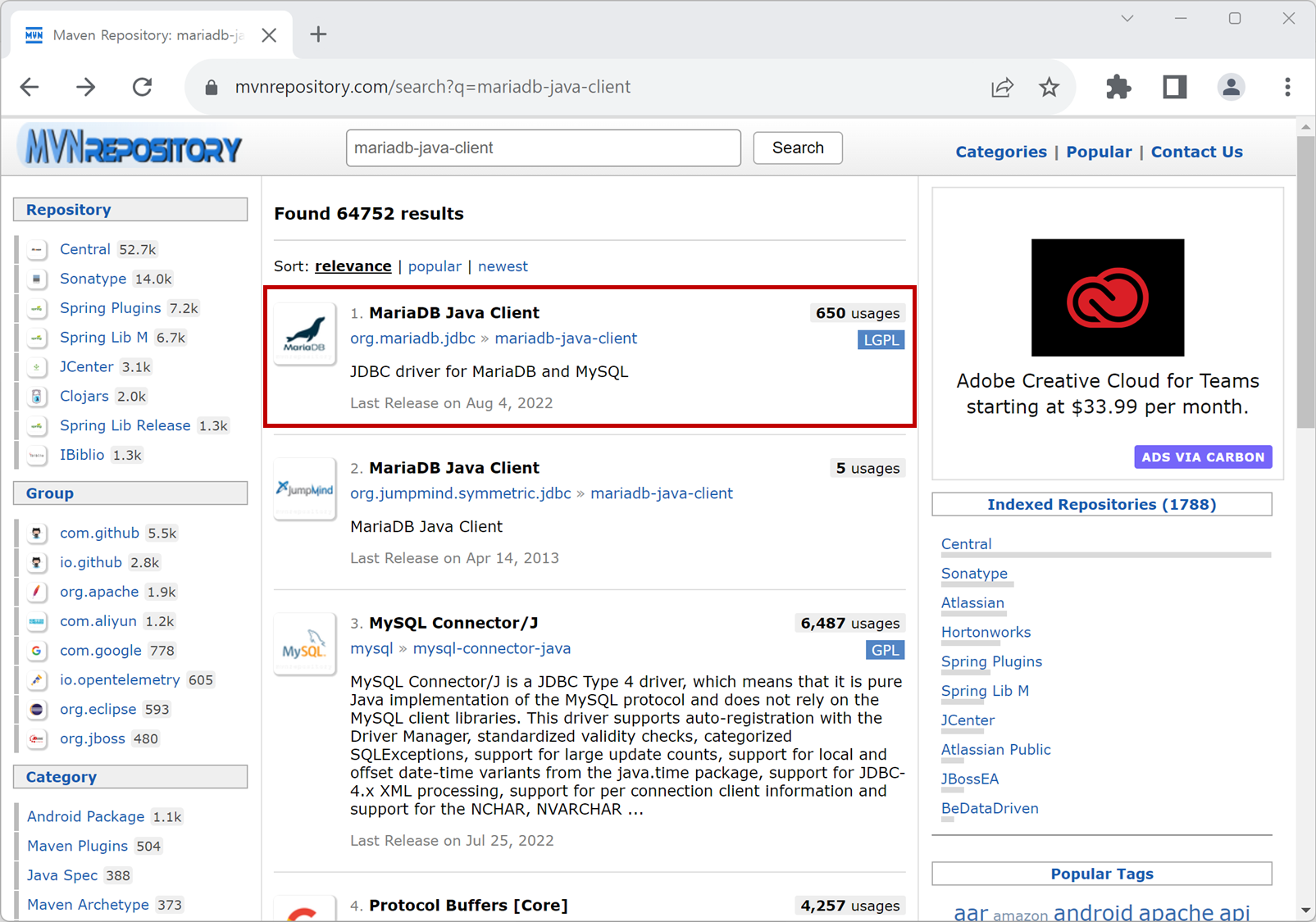 1. 메이븐 리포지토리(https://mvnrepository.com)에서 "mariadb-java-client"으로 검색합니다. 검색된 결과 중에 "org.mariadb.jdbc > mariadb-java-client"인 MariaDB Java Client를 선택합니다.