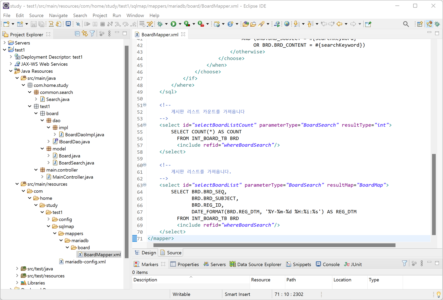 1. com.home.study.test1.sqlmapl.mappers.mariadb.board 패키지에 있는 BoardMapper.xml 파일을 오픈합니다.