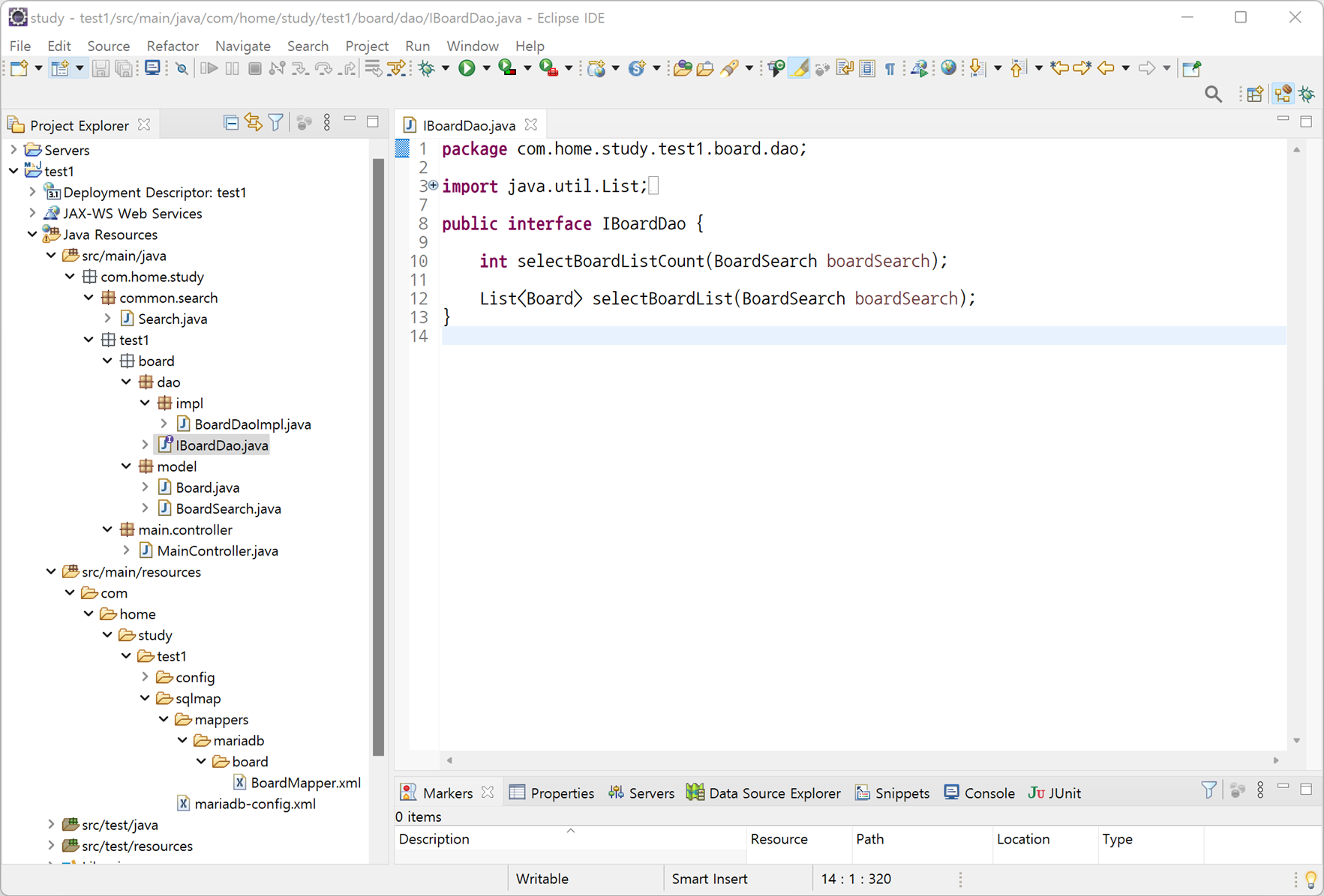 1. Java Resource > src/main/java에서 com.home.study.test1.board.dao 패키지에 있는 IBoardDao Interface(인터페이스)를 오픈합니다. (IBoardDao.java)
