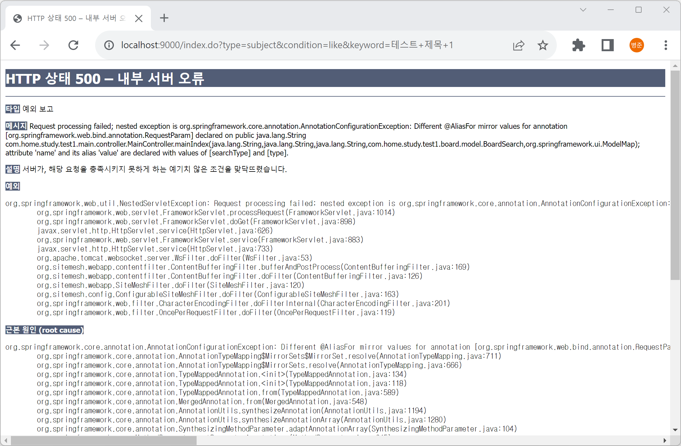 웹 요청 파라미터의 name이 "searchType"이고 value가 "type"으로 서로 다른 값으로 동시에 사용하면 오류(500)가 발생합니다. 그래서 name이나 value 중 하나만을 사용하길 바랍니다.