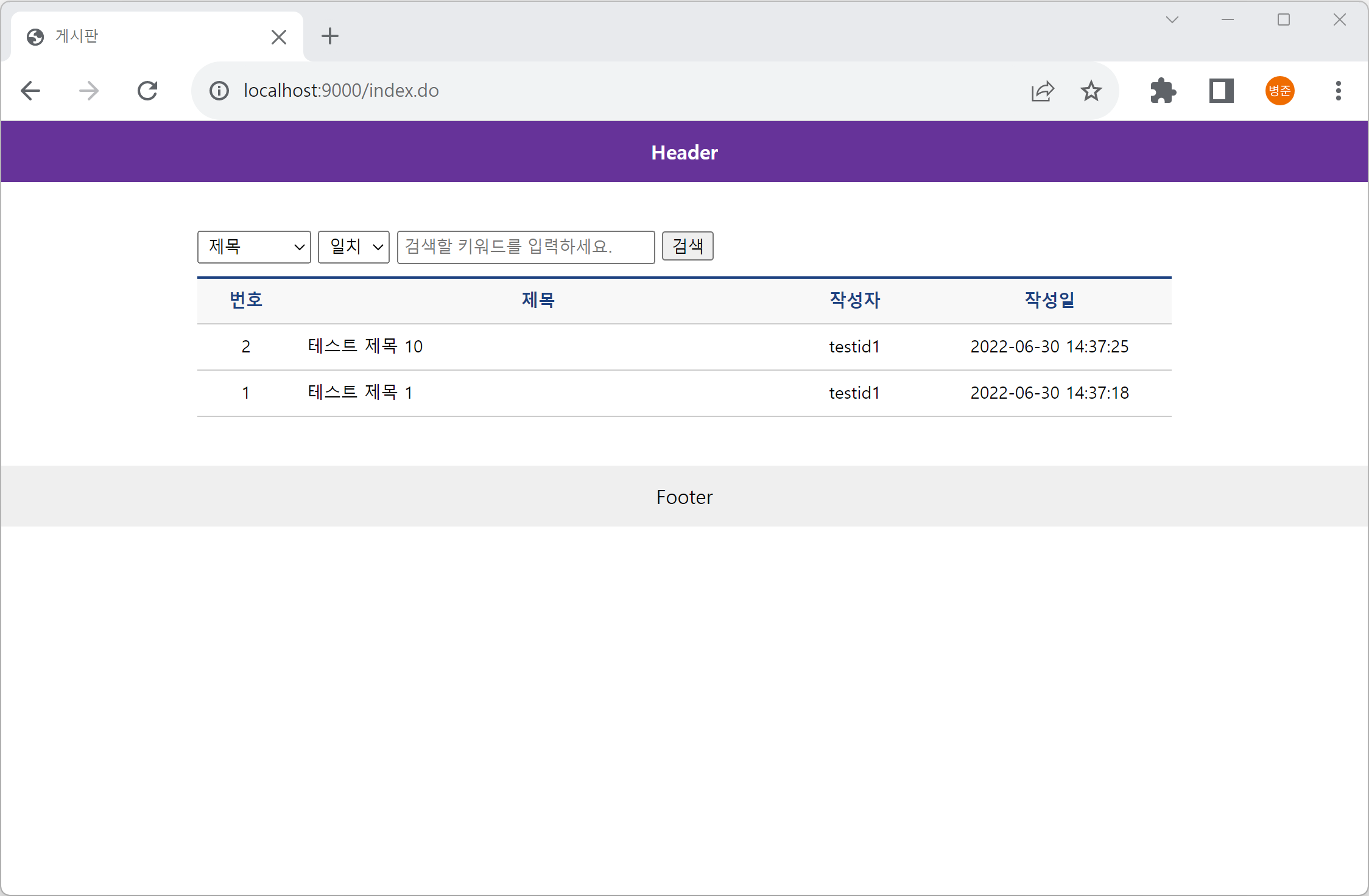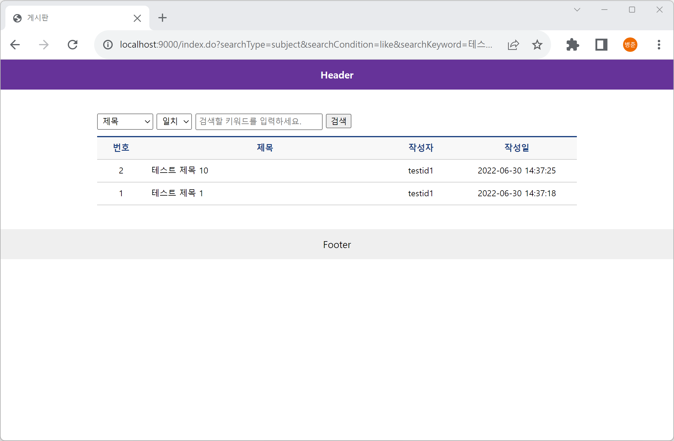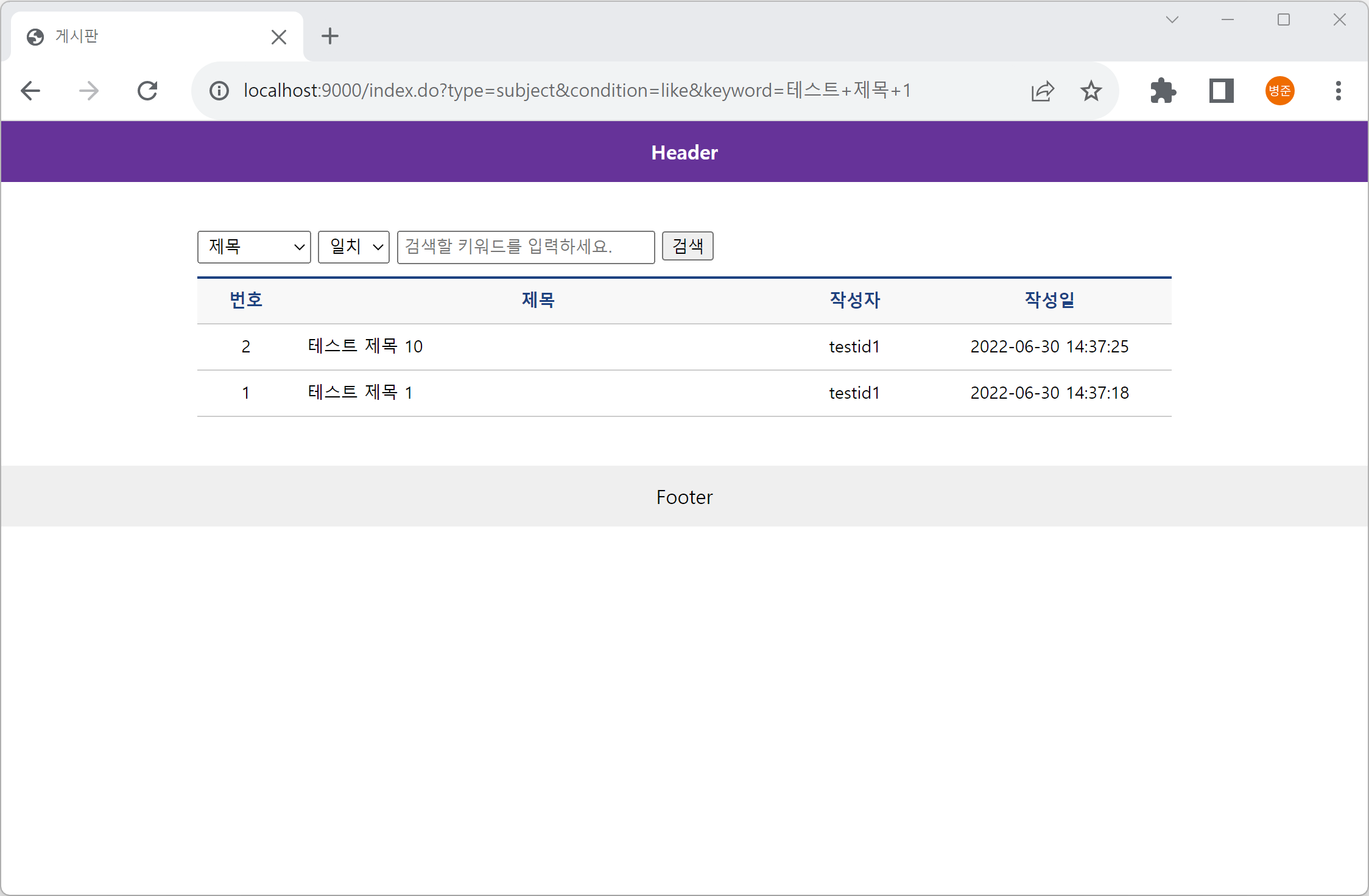 또는 "http://localhost:9000/index.do?searchType=subject&searchCondition=like&searchKeyword=테스트+제목+1"를 입력합니다.