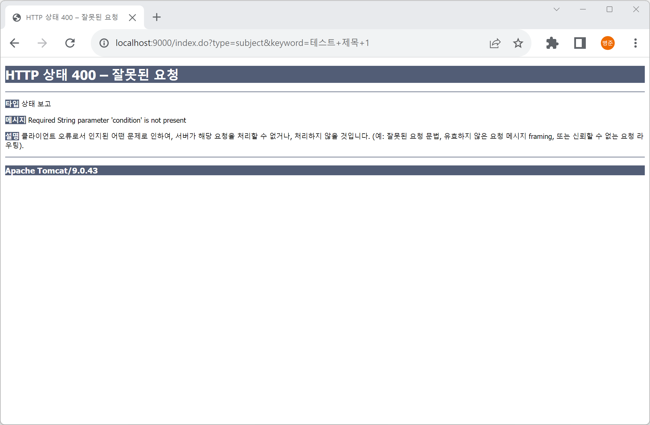 웹 요청 파라미터 이름인 condition이 필수일 때 값이 들어오지 않으면 'Bad Request(잘못된 요청)'으로 오류(400)가 발생합니다.