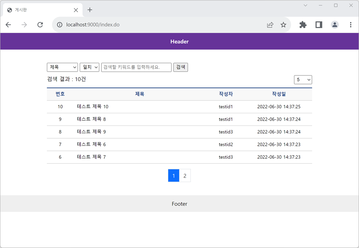 2. 웹 브라우저에서 "http://localhost:9000/index.do"를 입력합니다. 게시판의 전체 게시물이 10개이고 페이지 크기가 10 이기 때문에 페이지네이션에 페이지 번호가 1개 나타납니다.