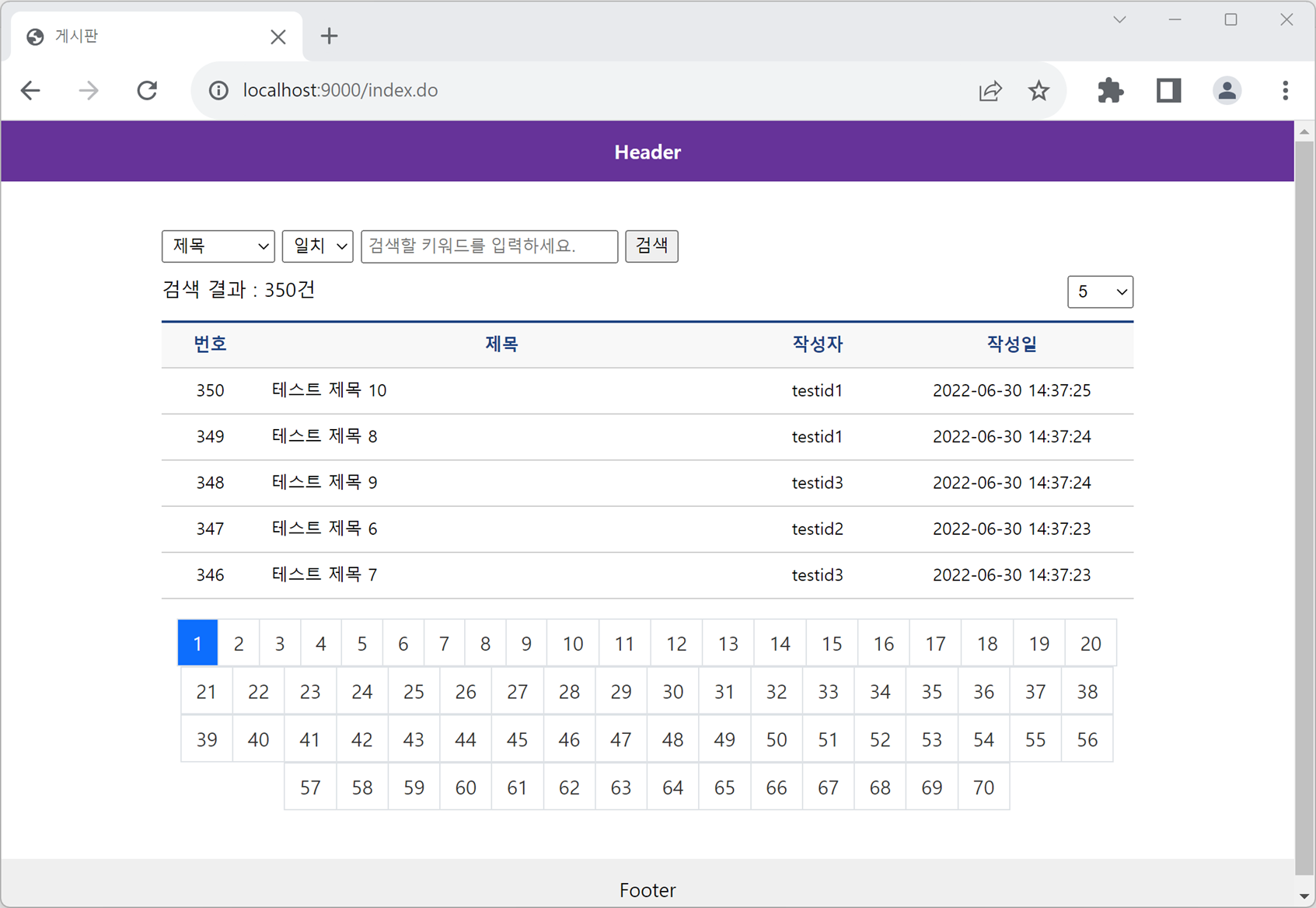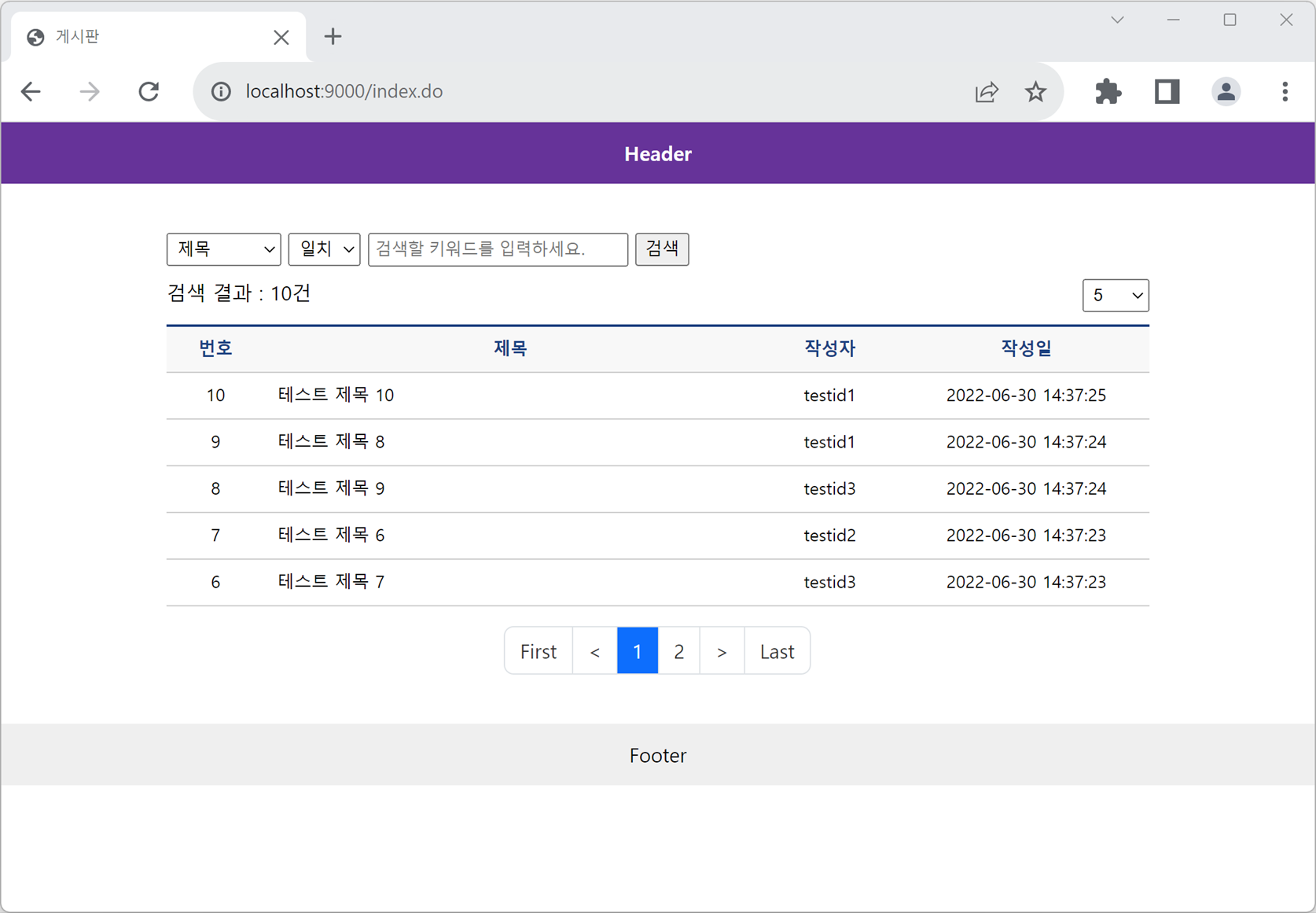2. 웹 브라우저에서 "http://localhost:9000/index.do"를 입력하고 페이지 크기를 10에서 5로 변경합니다.