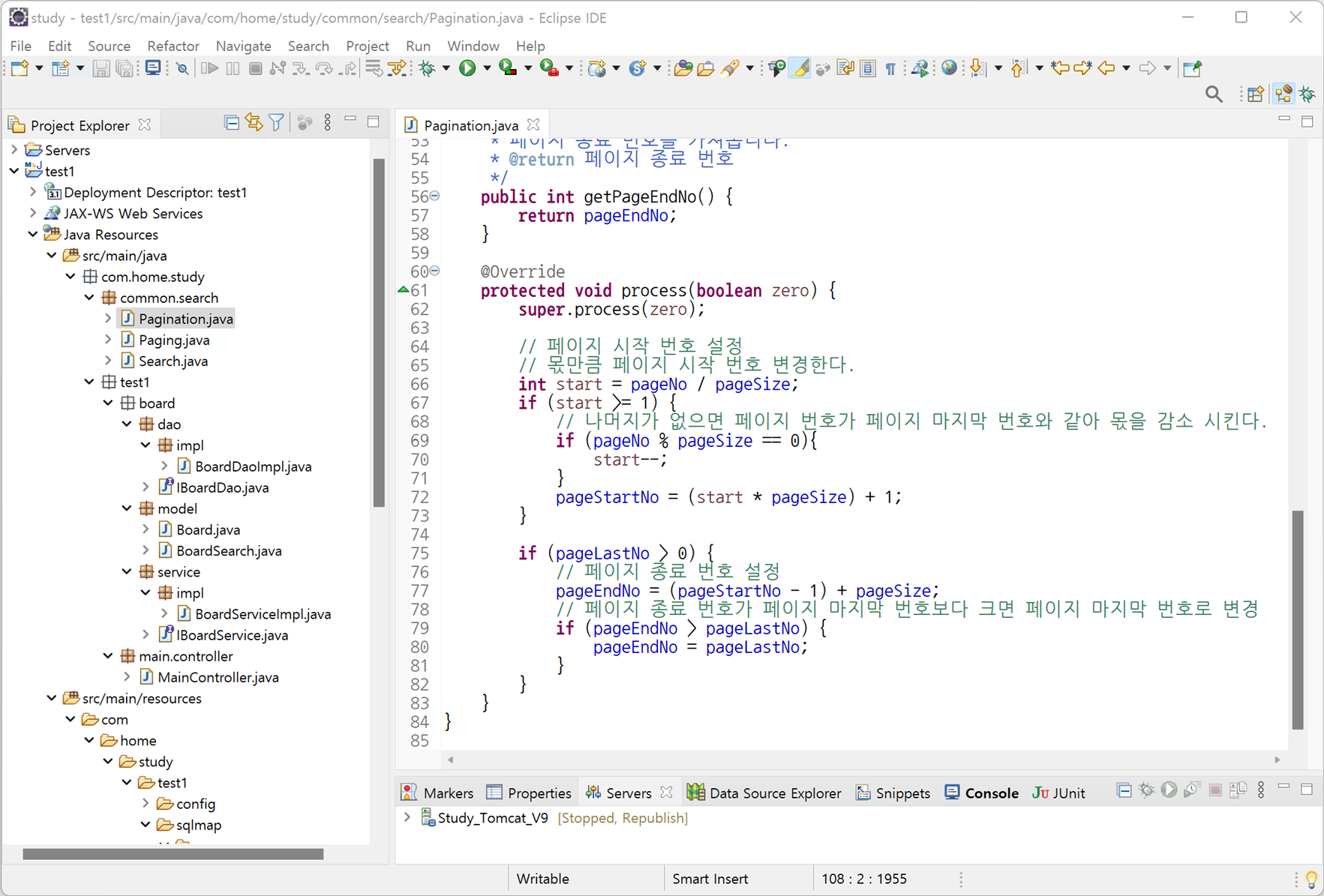 1. Java Resource > src/main/java에 com.home.study.common.search 패키지에 있는 Paging.java 파일을 오픈하고 private로 되어 있는 변수와 process() 메서드를 protected로 수정합니다.