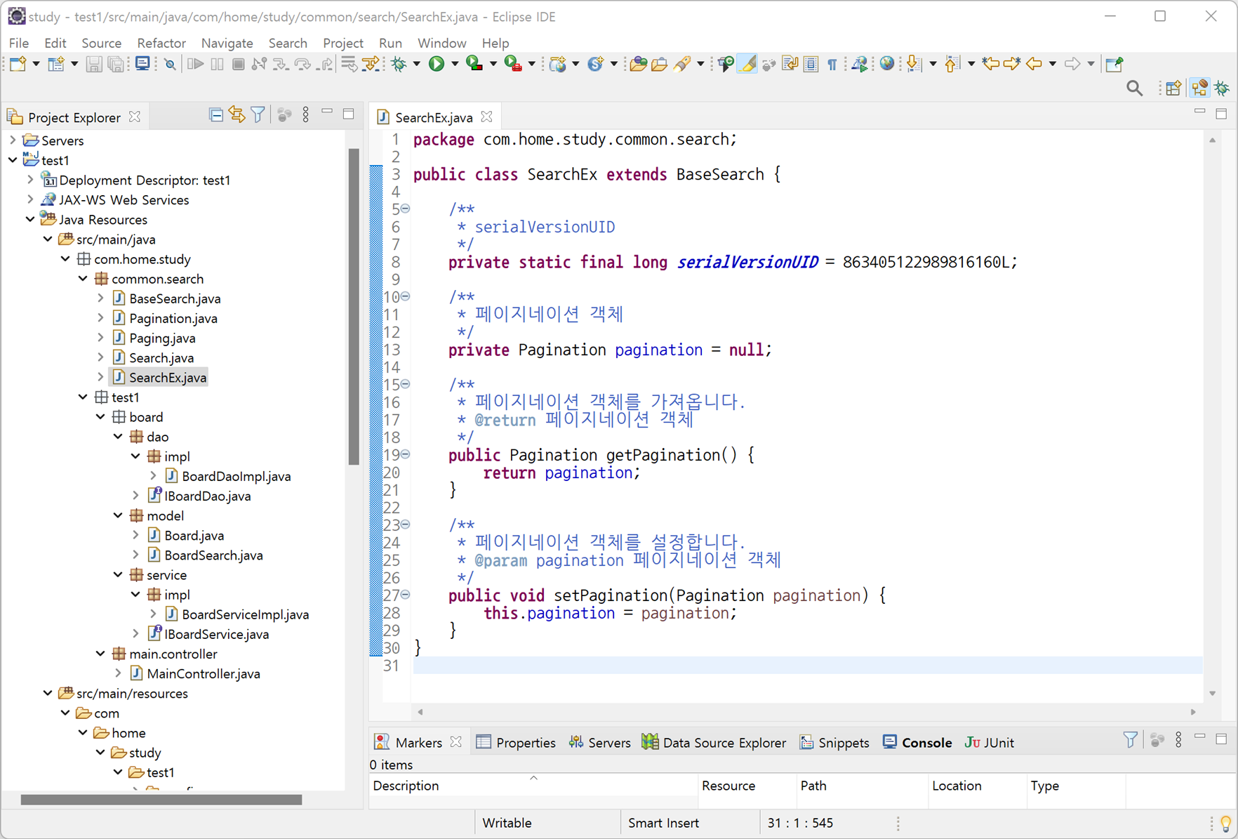 1. Java Resource > src/main/java > com.home.study.test1.board.service.impl.BoardServiceImpl.java 파일을 오픈합니다.