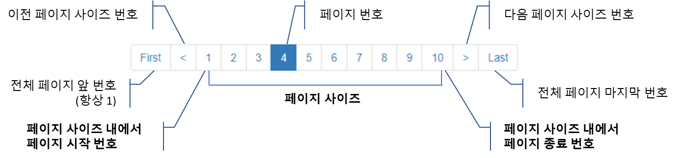 페이지네이션에서 노출될 페이지 번호 개수를 페이지 사이즈(pageSize)라고 하고 노출될 페이지 사이즈의 시작 번호를 페이지 시작 번호(pageStartNo), 노출될 페이지 사이즈의 종료 번호를 페이지 종료 번호(pageEndNo)라고 합니다.