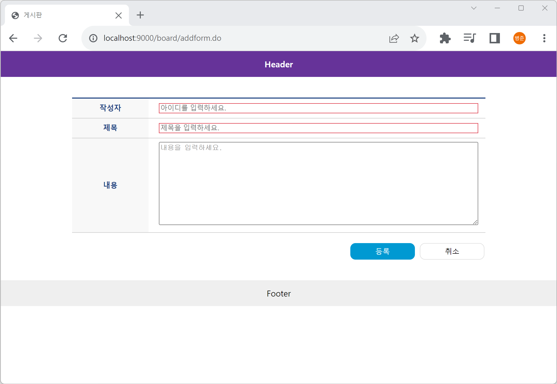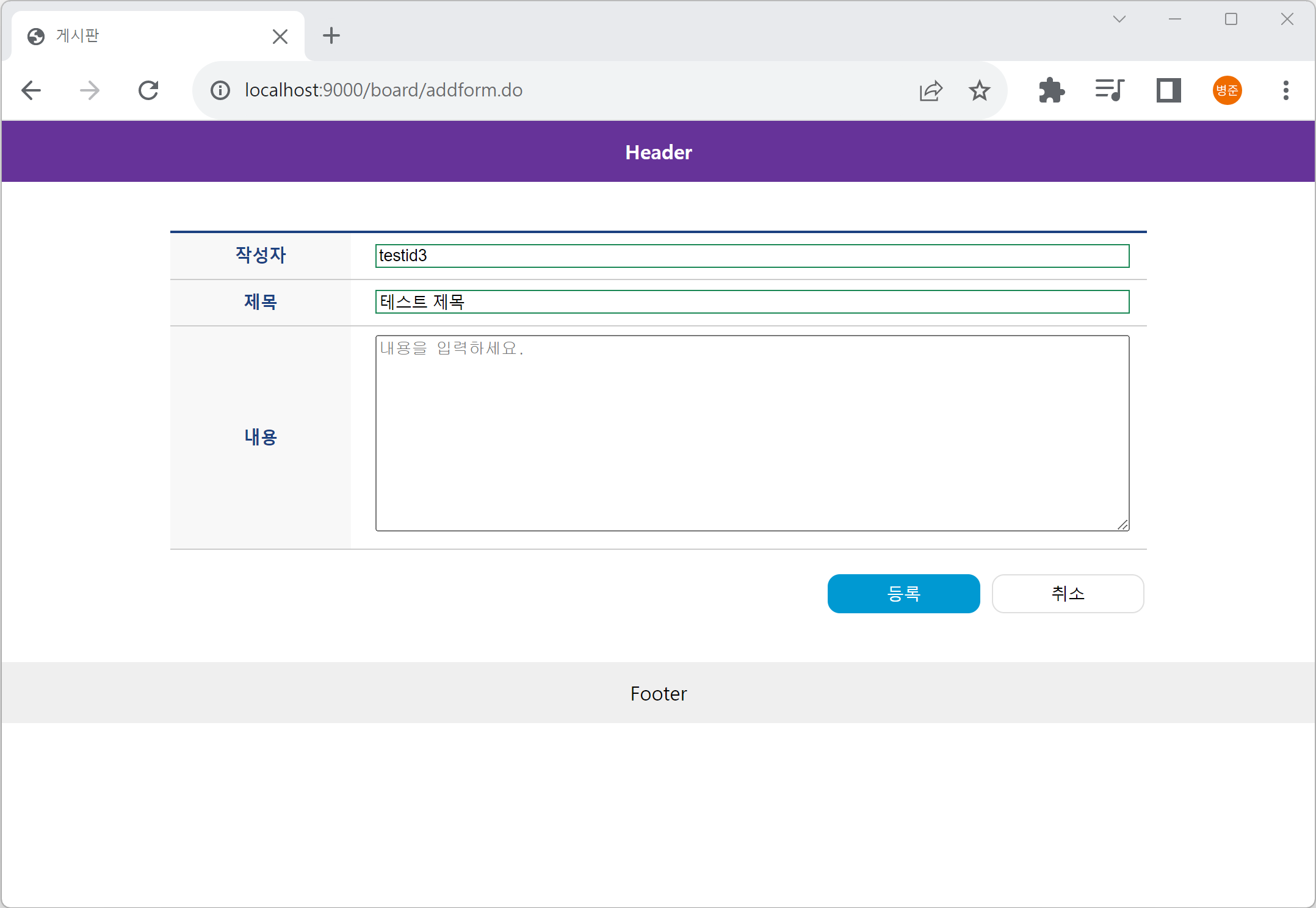 2. 웹 브라우저에서 "http://localhost:9000/index.do"를 입력하고 등록 버튼을 클릭하면 게시물 입력 폼(/board/addform.do)으로 이동됩니다.