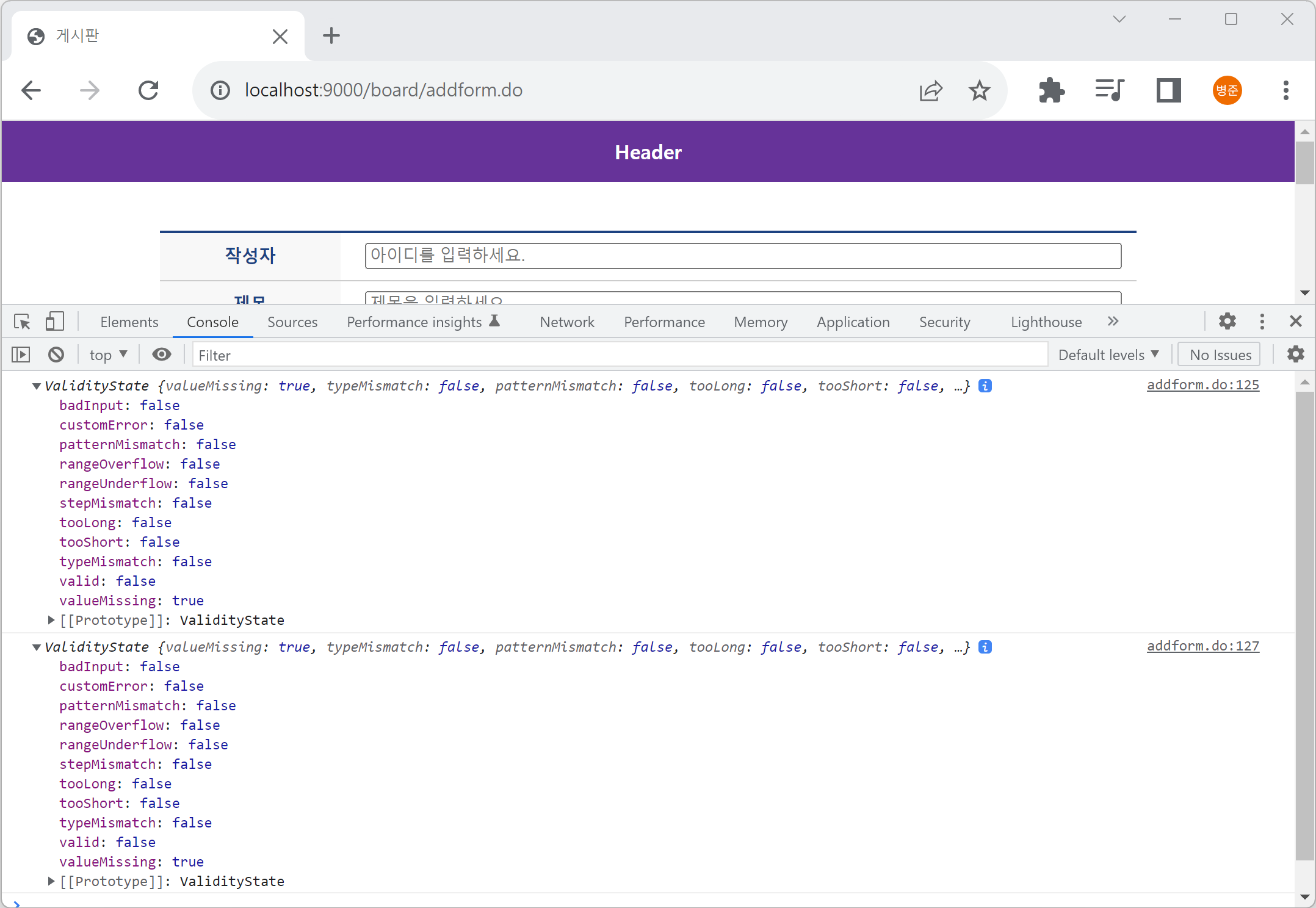 3. 등록 버튼을 누르고 콘솔을 확인하면 validity 속성 값이 출력됩니다.
