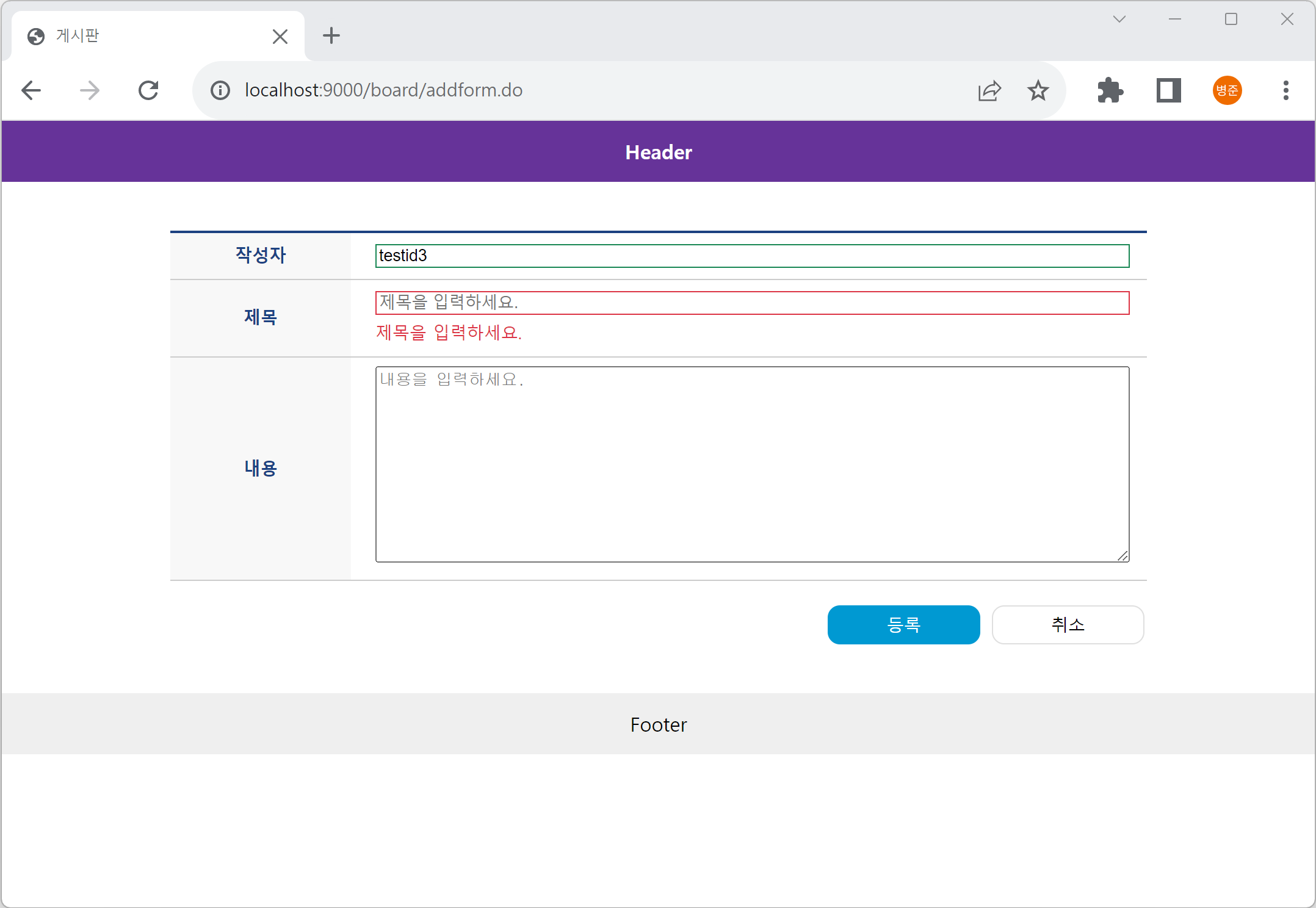 작성자(registrationId)에 "testid3"를 입력하고 subject(제목)에 "테스트 제목"을 입력하면 입력 요소가 녹색으로 표시되는 것을 확인할 수 있습니다.