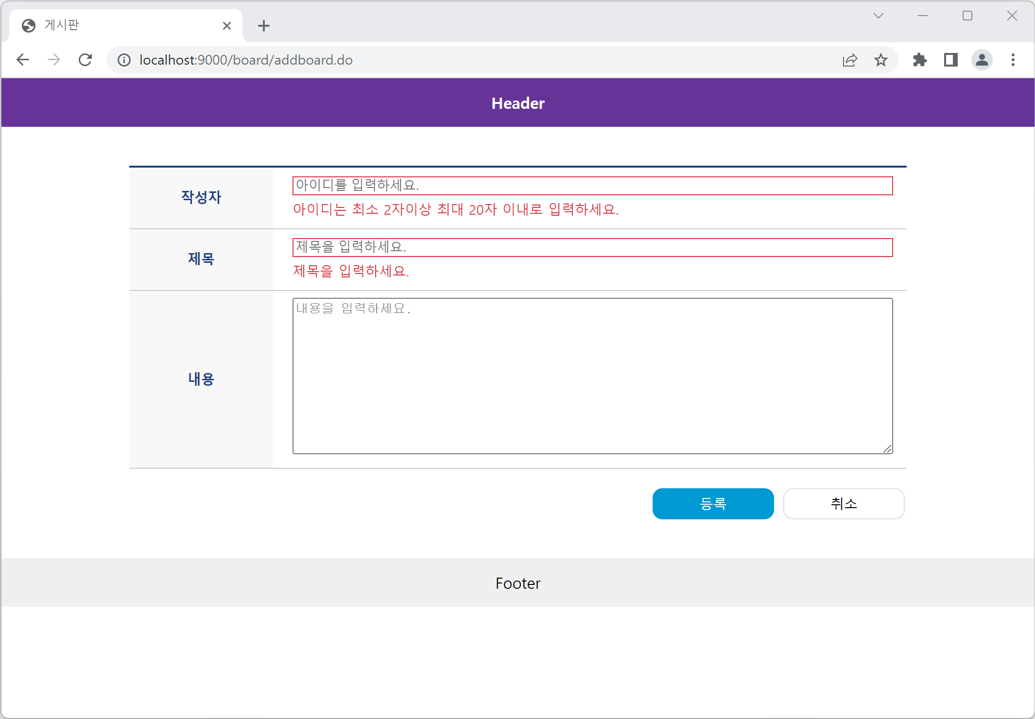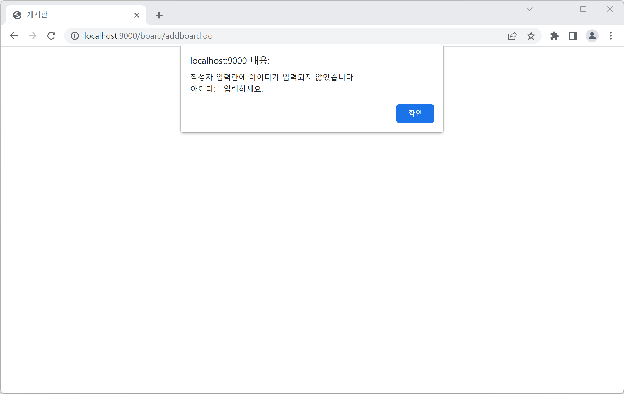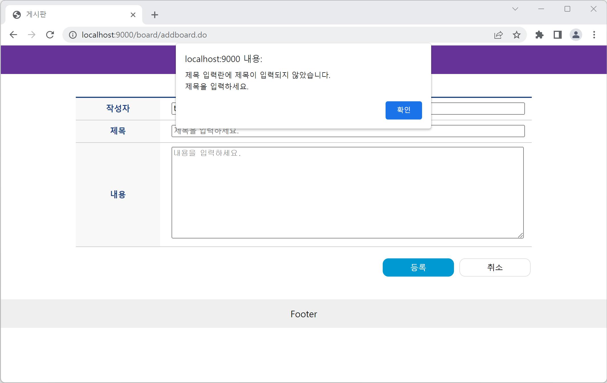 3. 입력 폼에서 작성자, 제목, 내용에 입력하지 않고 등록 버튼을 클릭합니다. 그러면 작성자가 빈 값이기 때문에 alert으로 에러 메시지가 노출됩니다. 확인 버튼을 누르면 작성자 입력란으로 포커스가 이동됩니다.