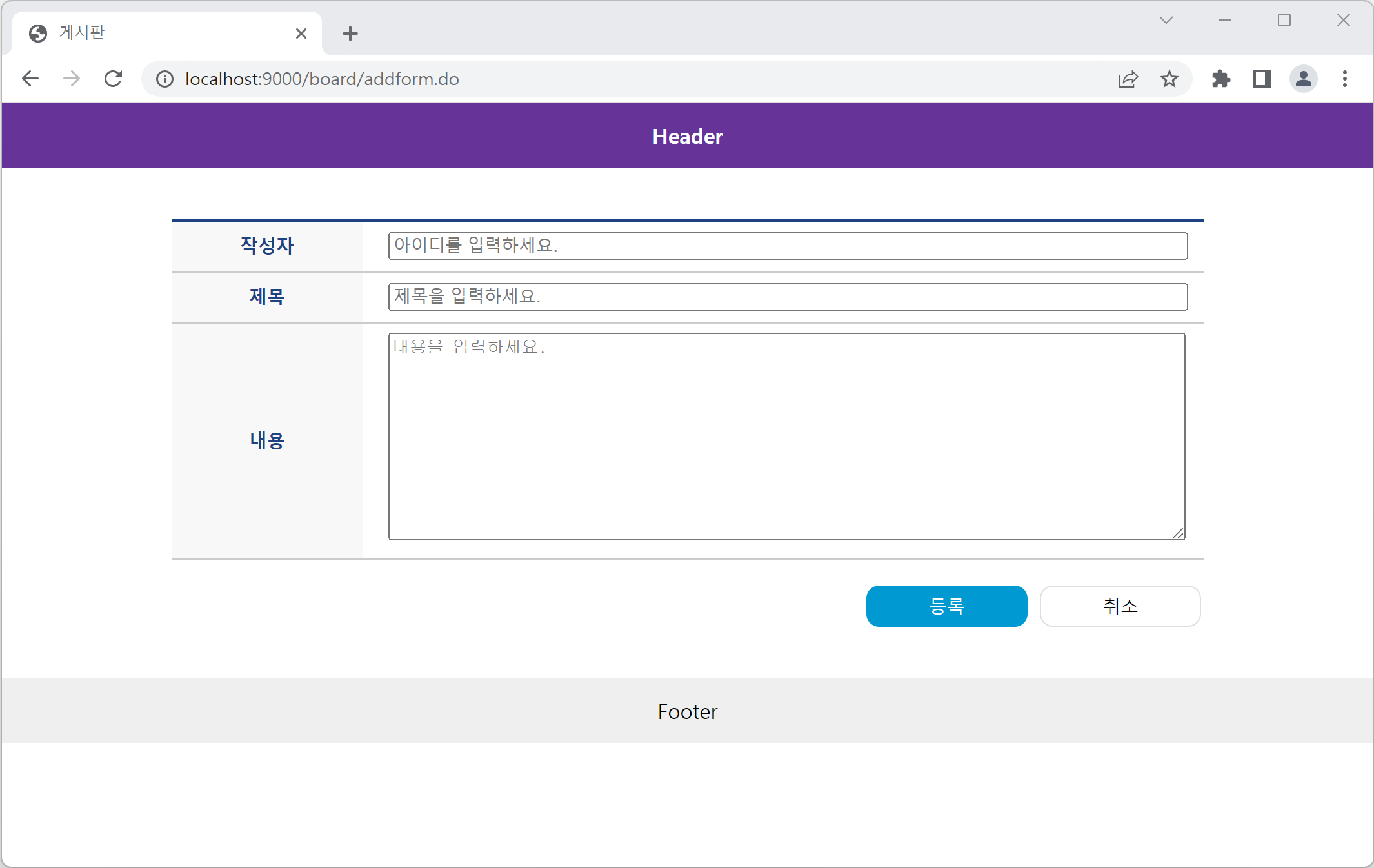 2. 웹 브라우저에서 "http://localhost:9000/index.do"를 입력하고 등록 버튼을 클릭하면 게시물 입력 폼(/board/addform.do)으로 이동됩니다.