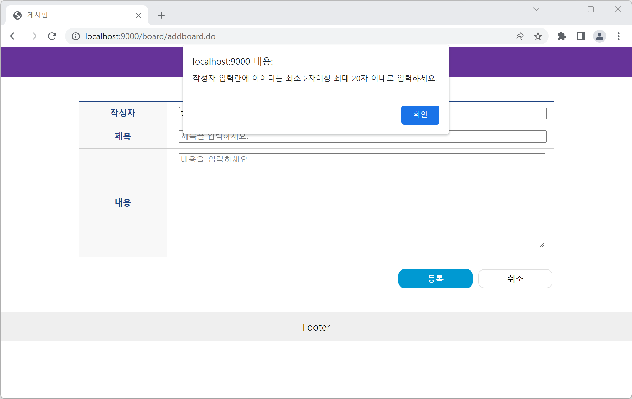 4. 입력 폼에서 작성자에 "t" 입력하고 등록 버튼을 클릭합니다. 그러면 작성자의 길이가 유효하지 않아서 alert으로 에러 메시지가 노출됩니다. 확인 버튼을 누르면 작성자 입력란으로 포커스가 이동됩니다.