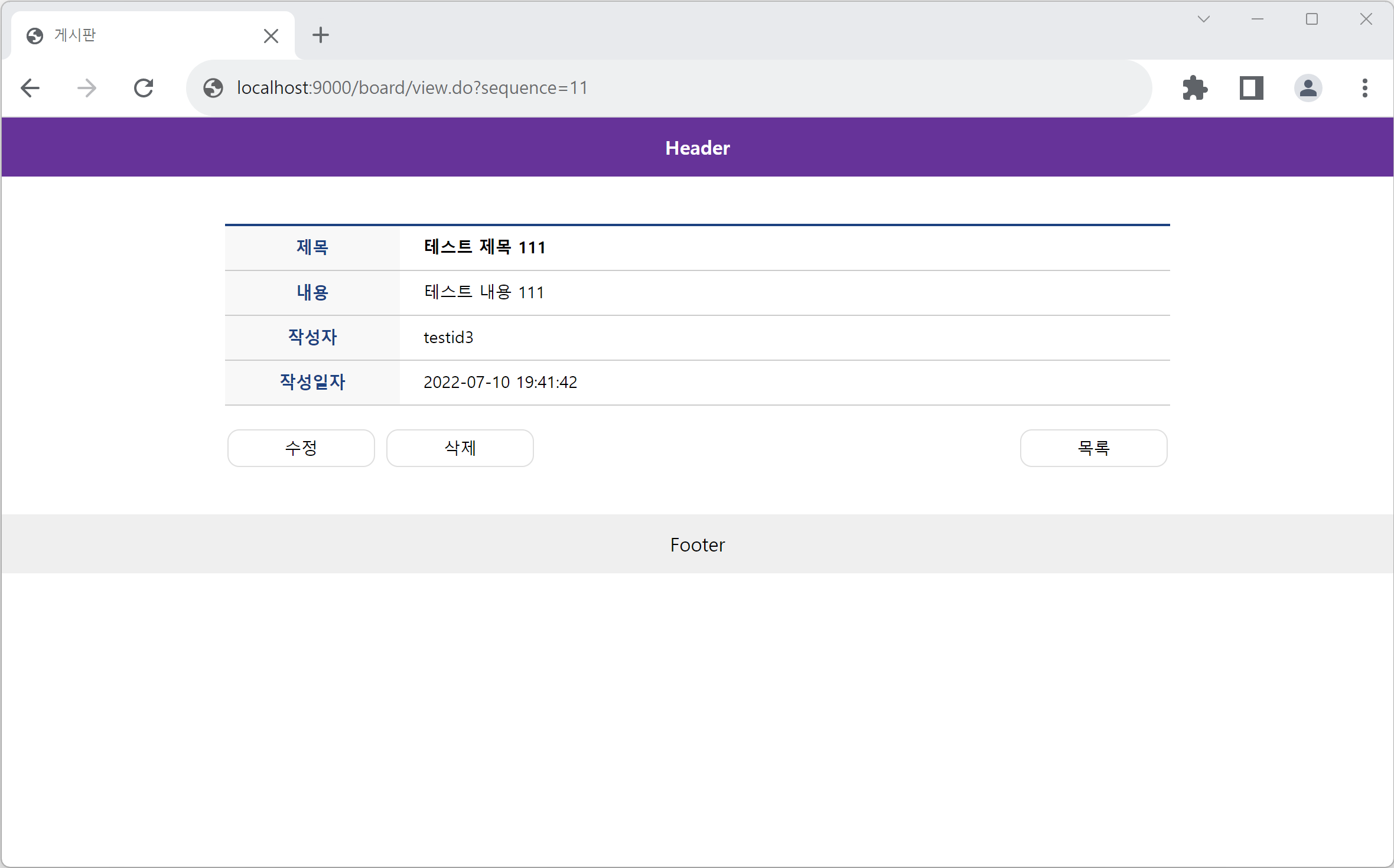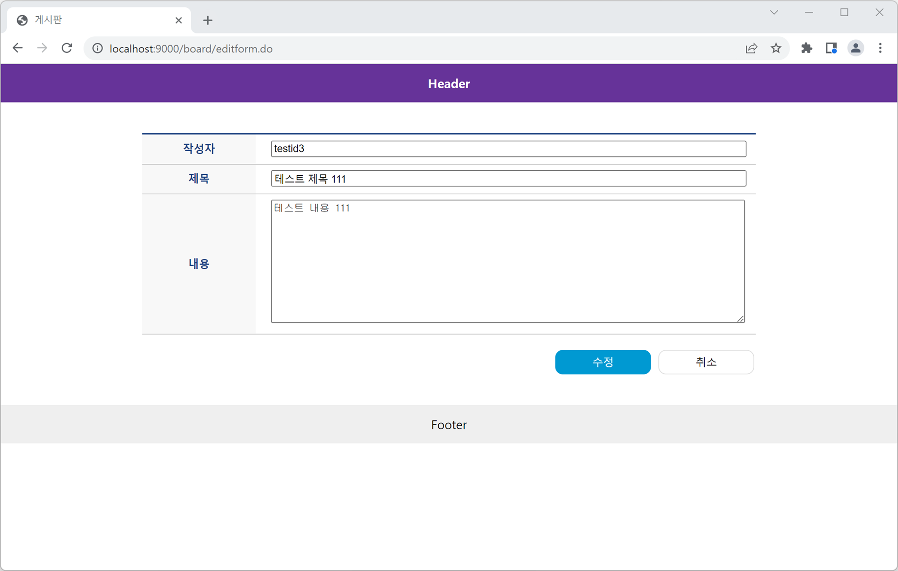 2. 웹 브라우저에서 "http://localhost:9000/index.do"를 입력하고 게시물 리스트에서 11번인 "테스트 제목 11"을 클릭한 후 수정 버튼을 누릅니다. 그리고 제목을 "테스트 제목 111"ㄹ 내용을 "테스트 내용 111"로 수정합니다.