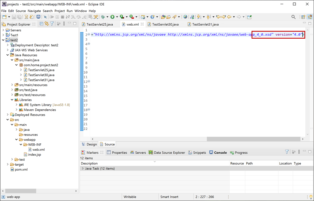 1. test2 프로젝트의 "pom.xml"을 오픈하여 "Java.servlet-api"의 버전을 "3.1.0"에서 "4.0.1"로 변경하고 저장합니다.
