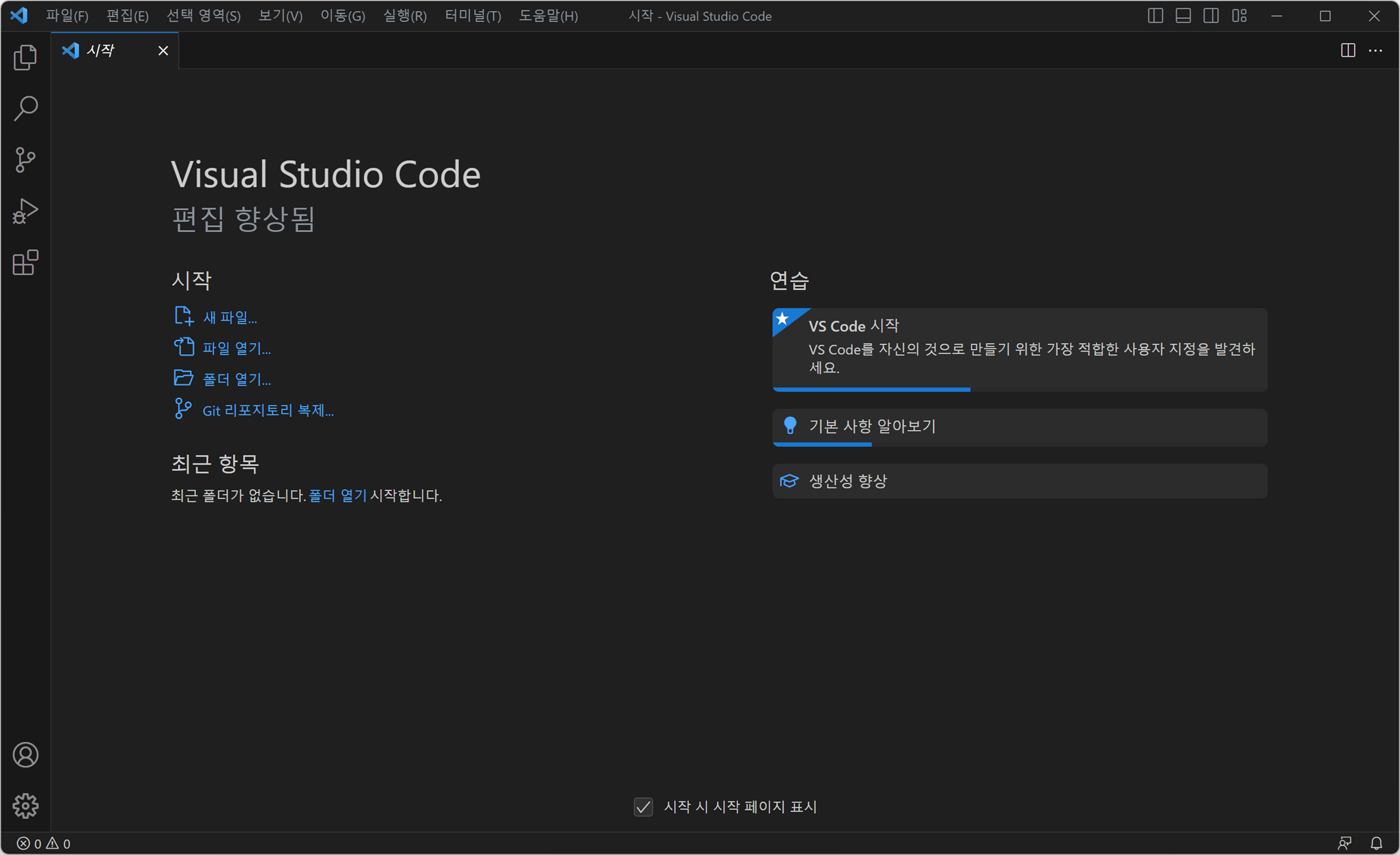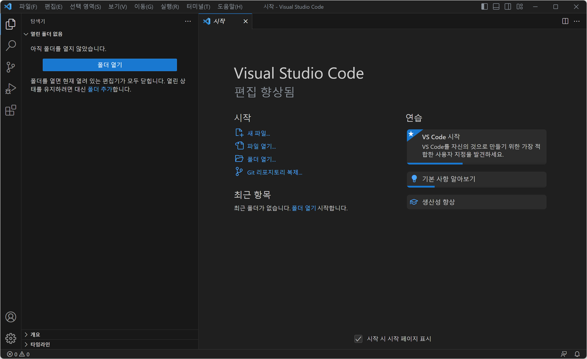 5. "Change Language and Restart" 버튼을 클릭하면 Visual Studio Code가 한국어로 변경되어 실행됩니다.