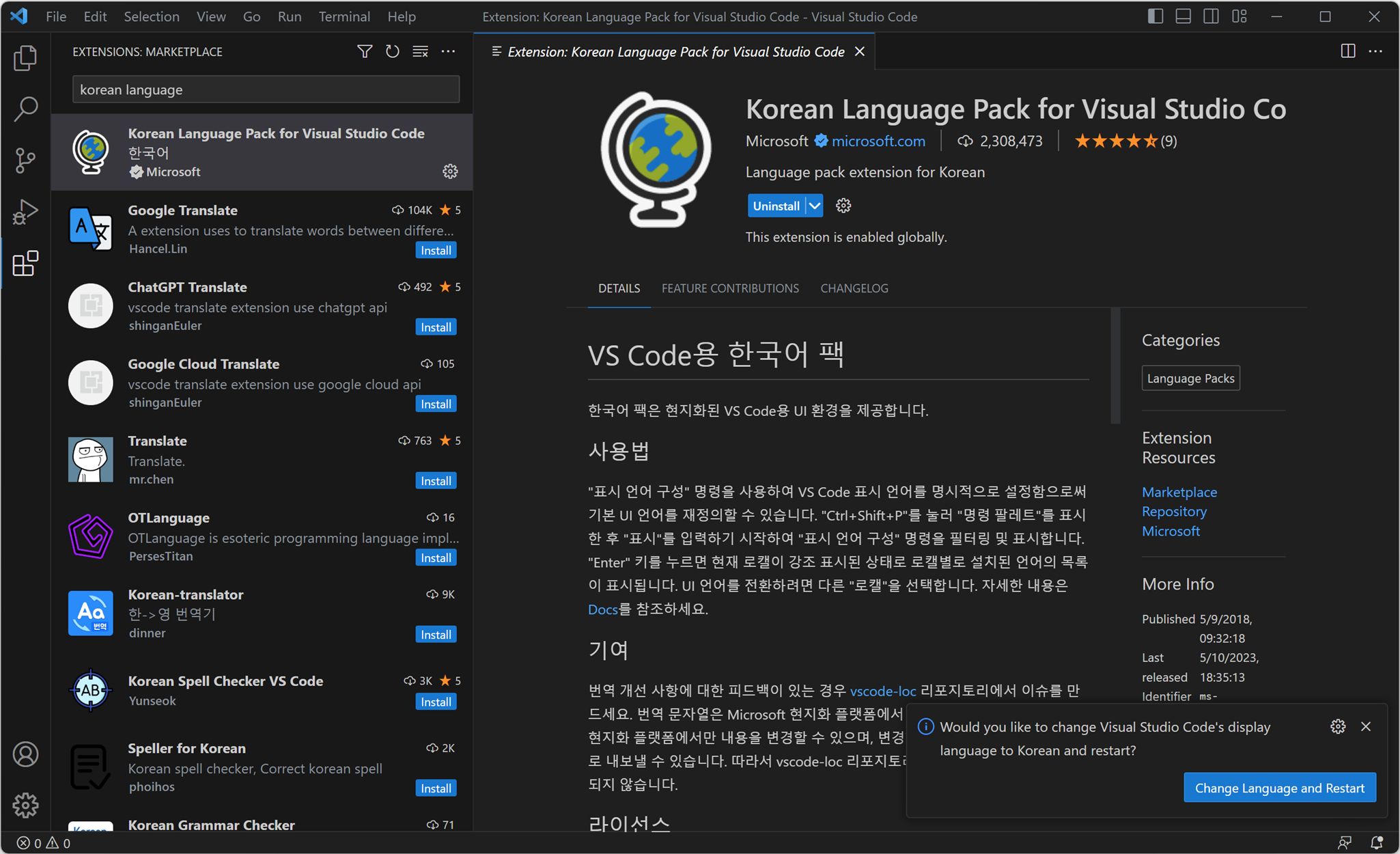 4. 그러면 한국어 언어 팩이 설치됩니다. 그리고 하단에 언어 변경을 위한 "Change Language and Restart"버튼이 나타납니다.