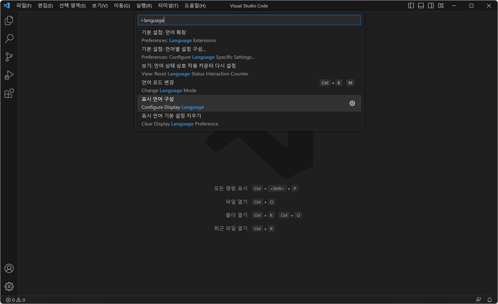1. Ctrl + Shift + P를 눌러 명령 팔레트(Command Palette)를 실행시킨 후 입력란에서 "language"를 입력합니다. 그리고 검색된 결과에서 표시 언어 구성(Configure Display Language)을 선택합니다.