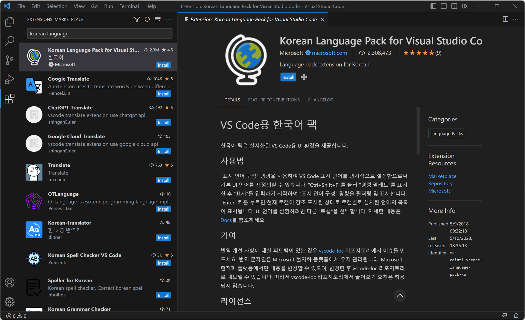 3. "Korean Language Pack for Visual Studio Code"를 선택하고 "Install"버튼을 클릭합니다.