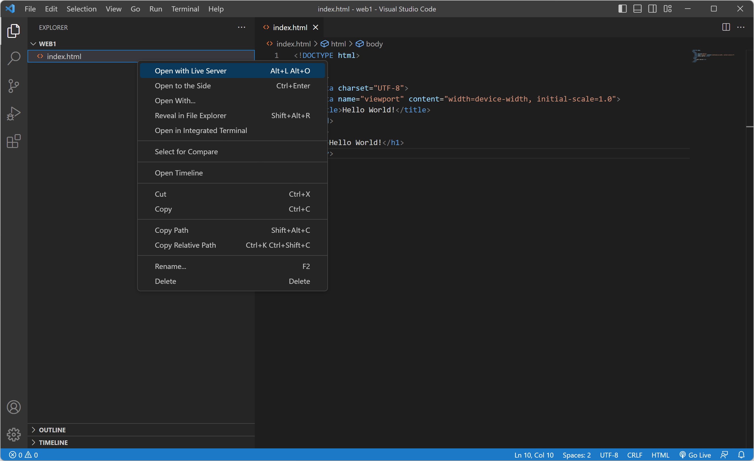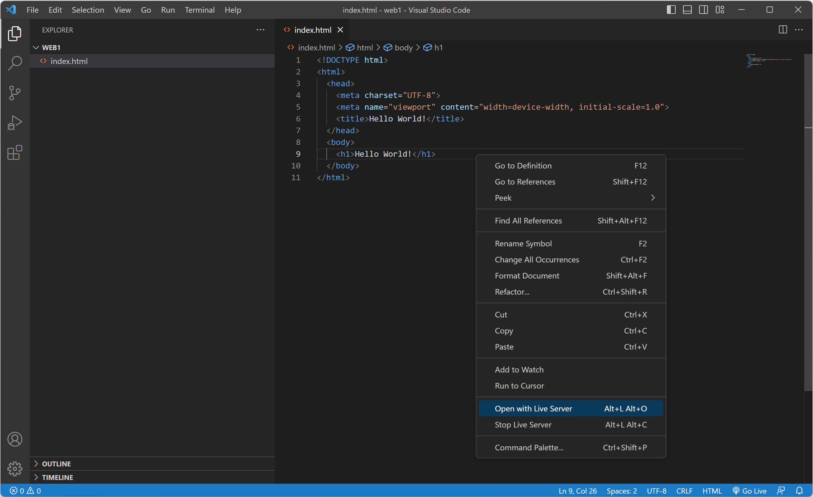 또는 "index.html"파일 편집기에서 마우스 오른쪽 버튼을 눌러 콘텍스트 메뉴에서 "Open with Live Server"를 클릭합니다.