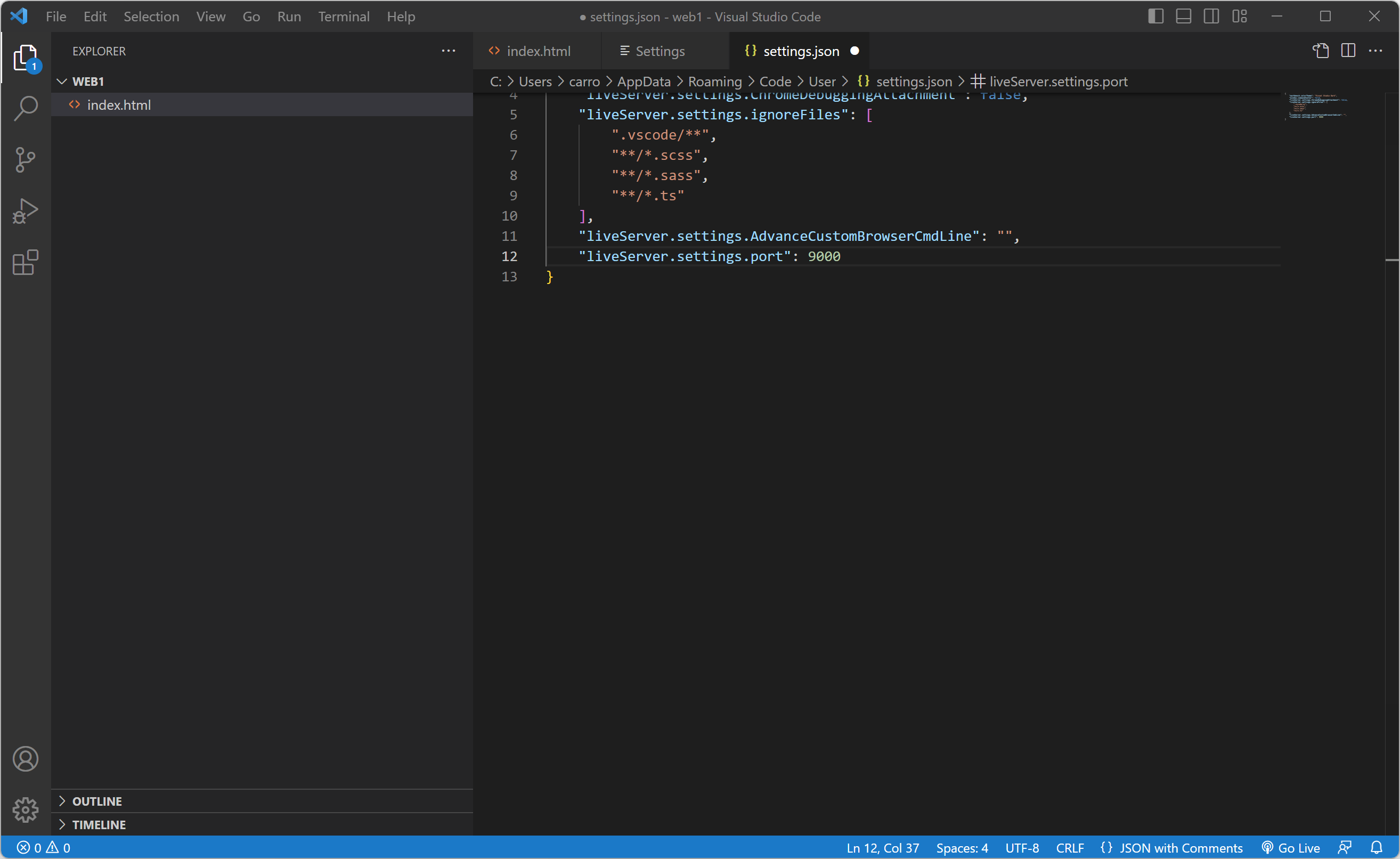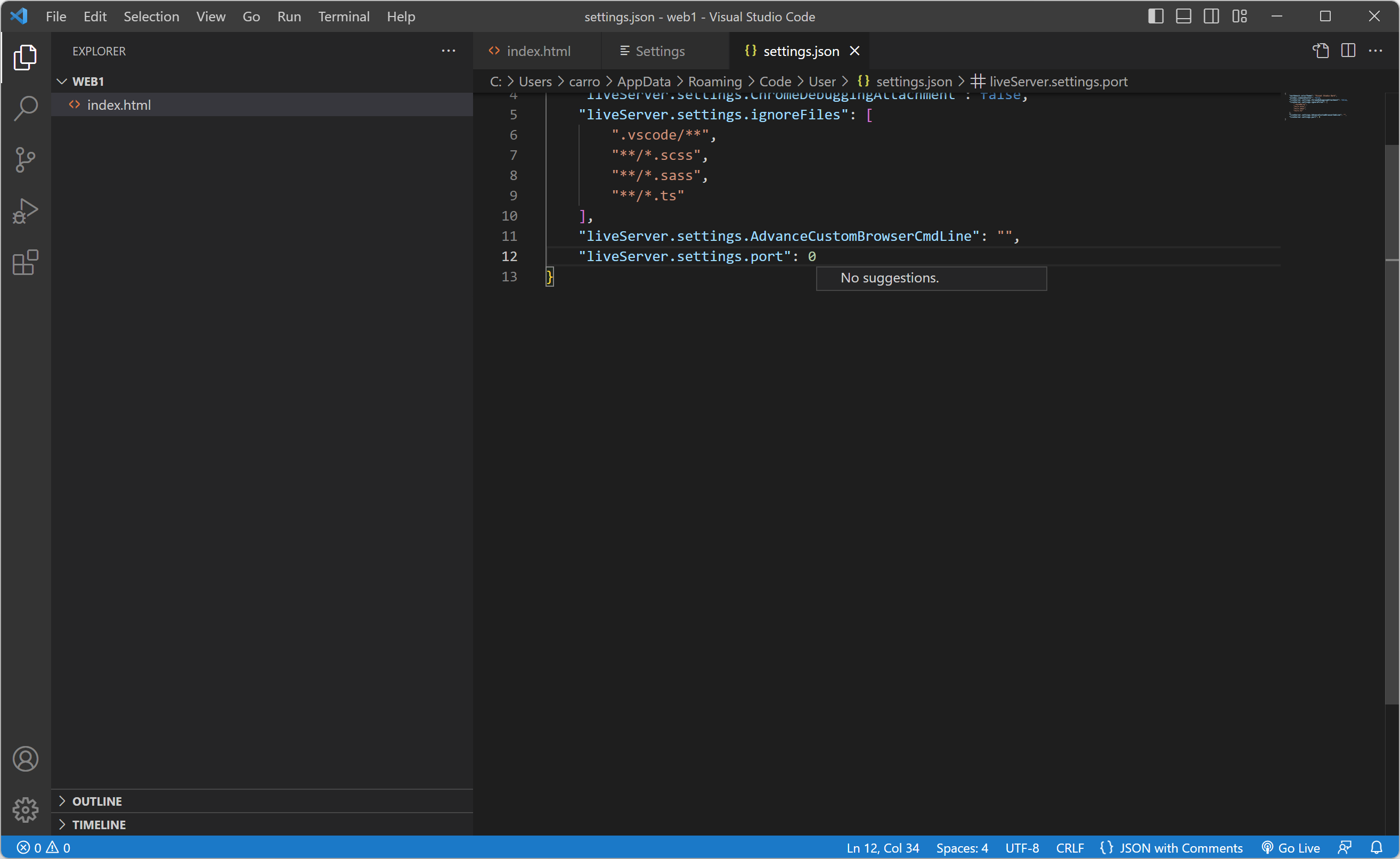 Live Server Config에서 Settings: Port로 이동하고 "Edit in settings.json(settings.json에서 편집)"를 클릭합니다.