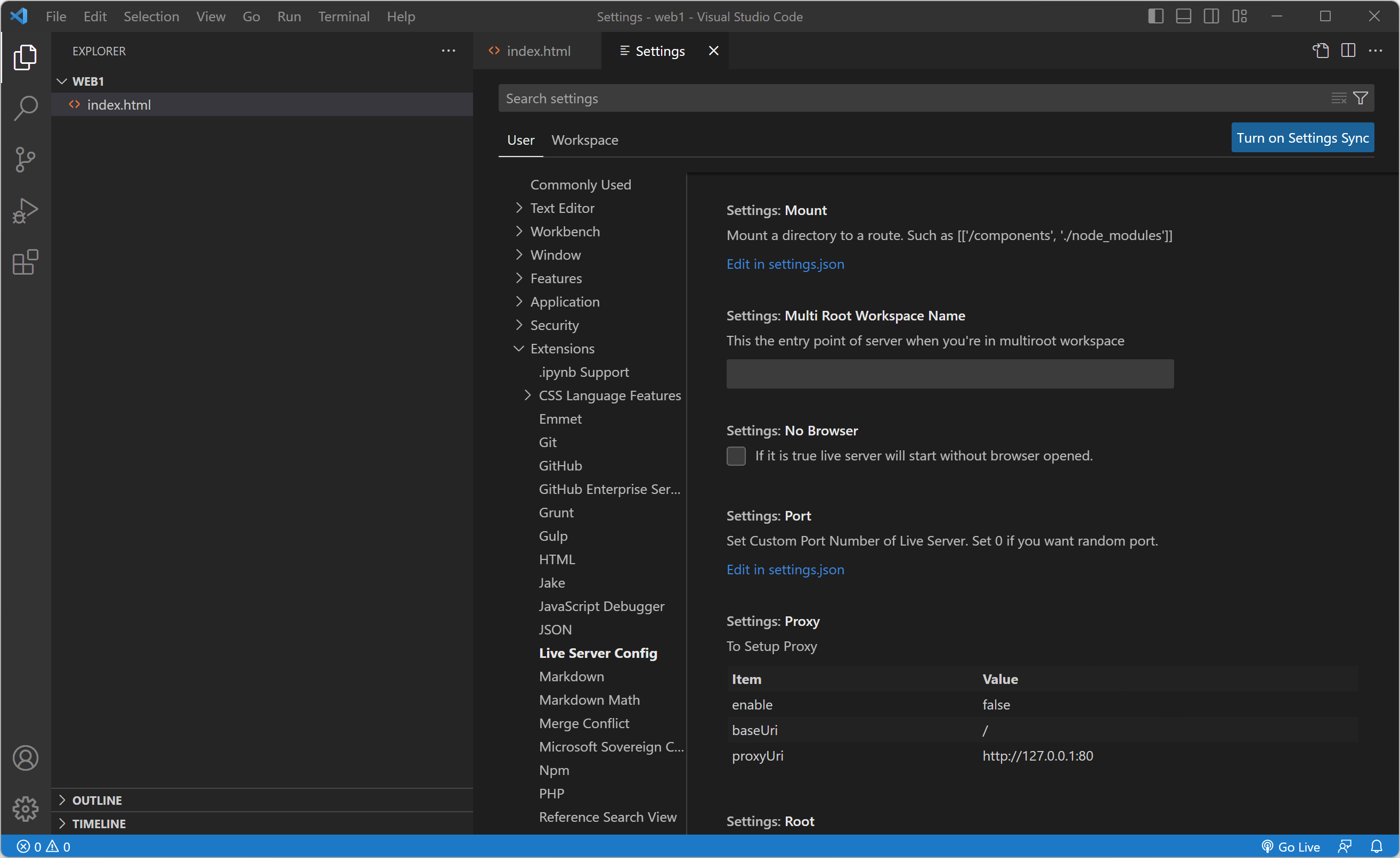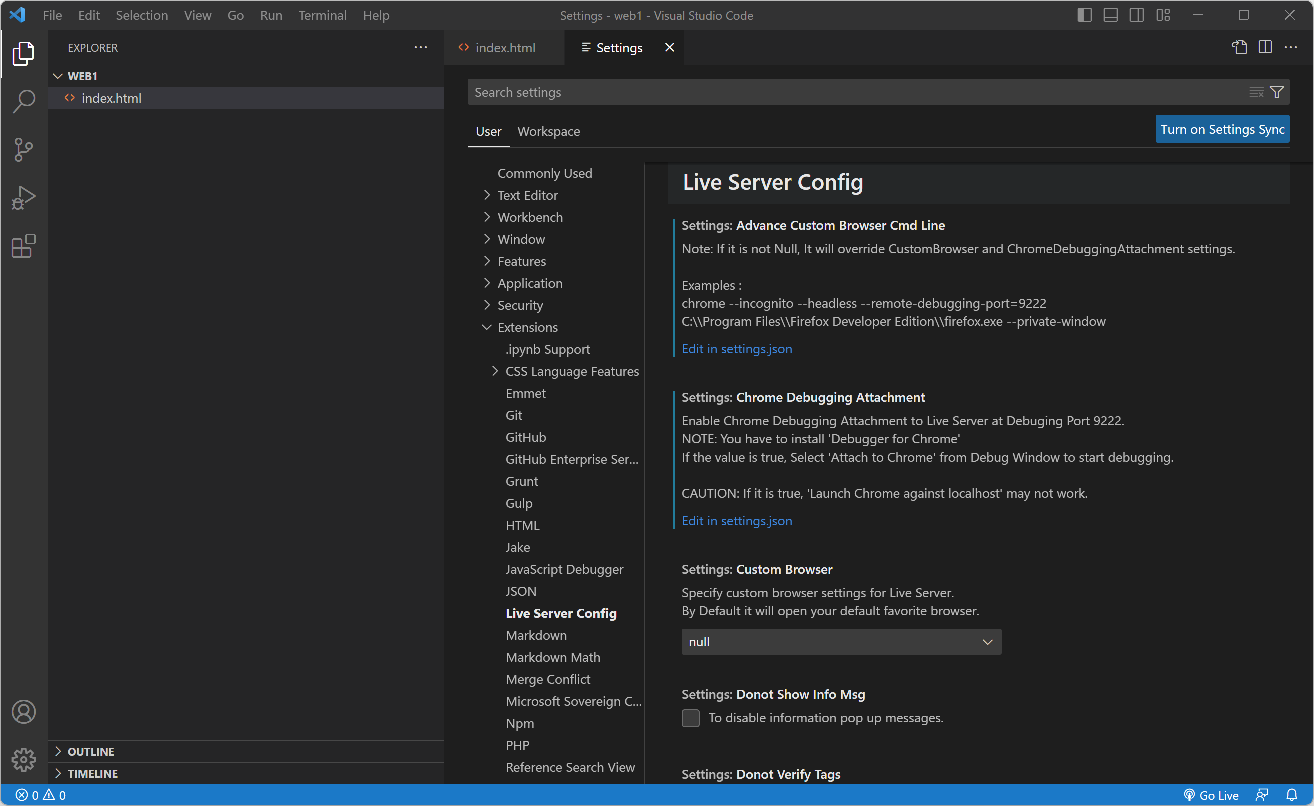 2. Settings(설정)의 Extensions(학장)에서 Live Server Config를 선택합니다.