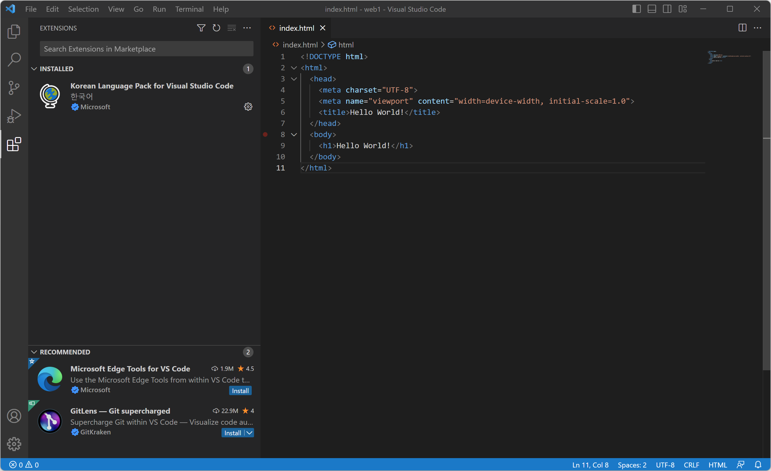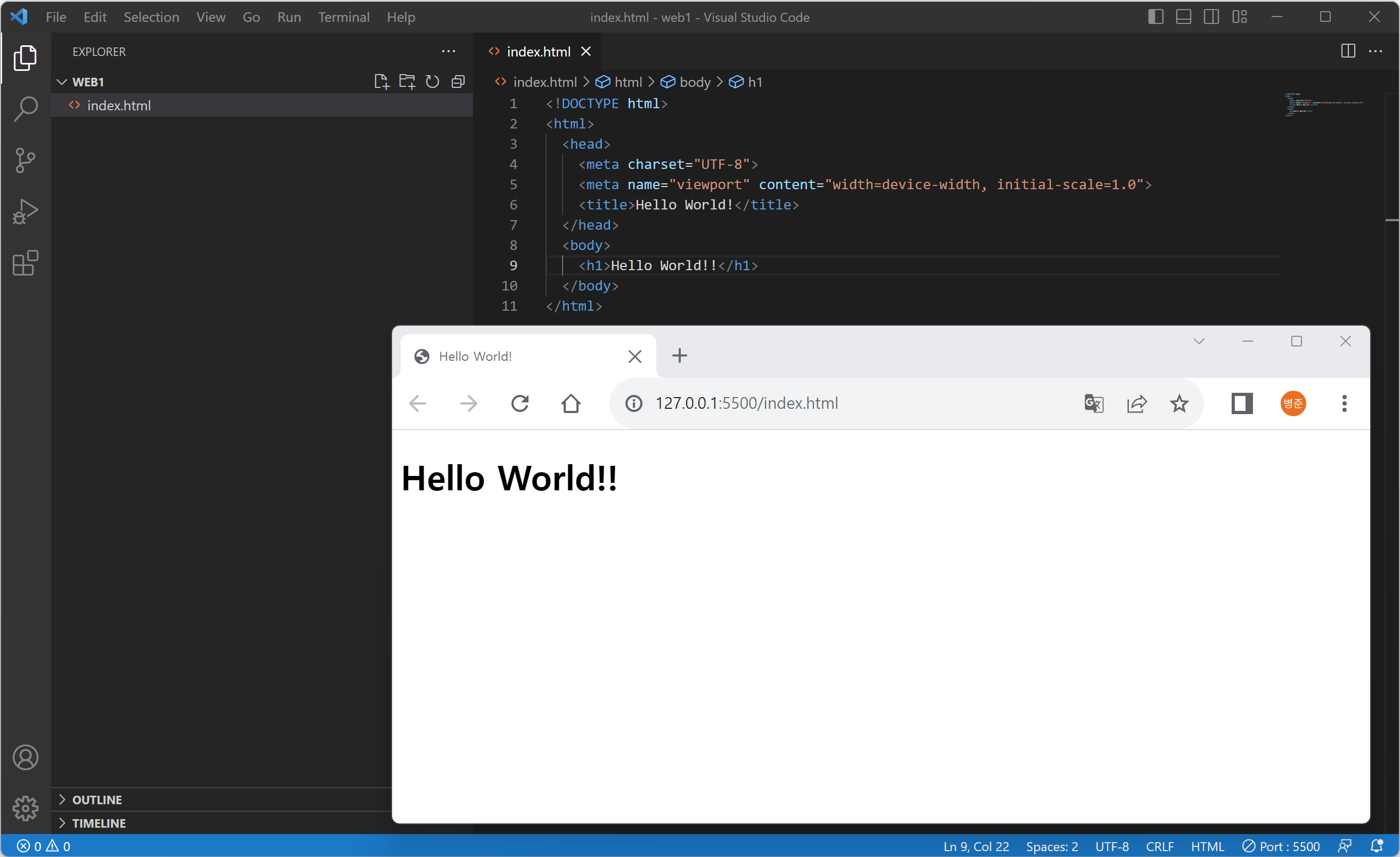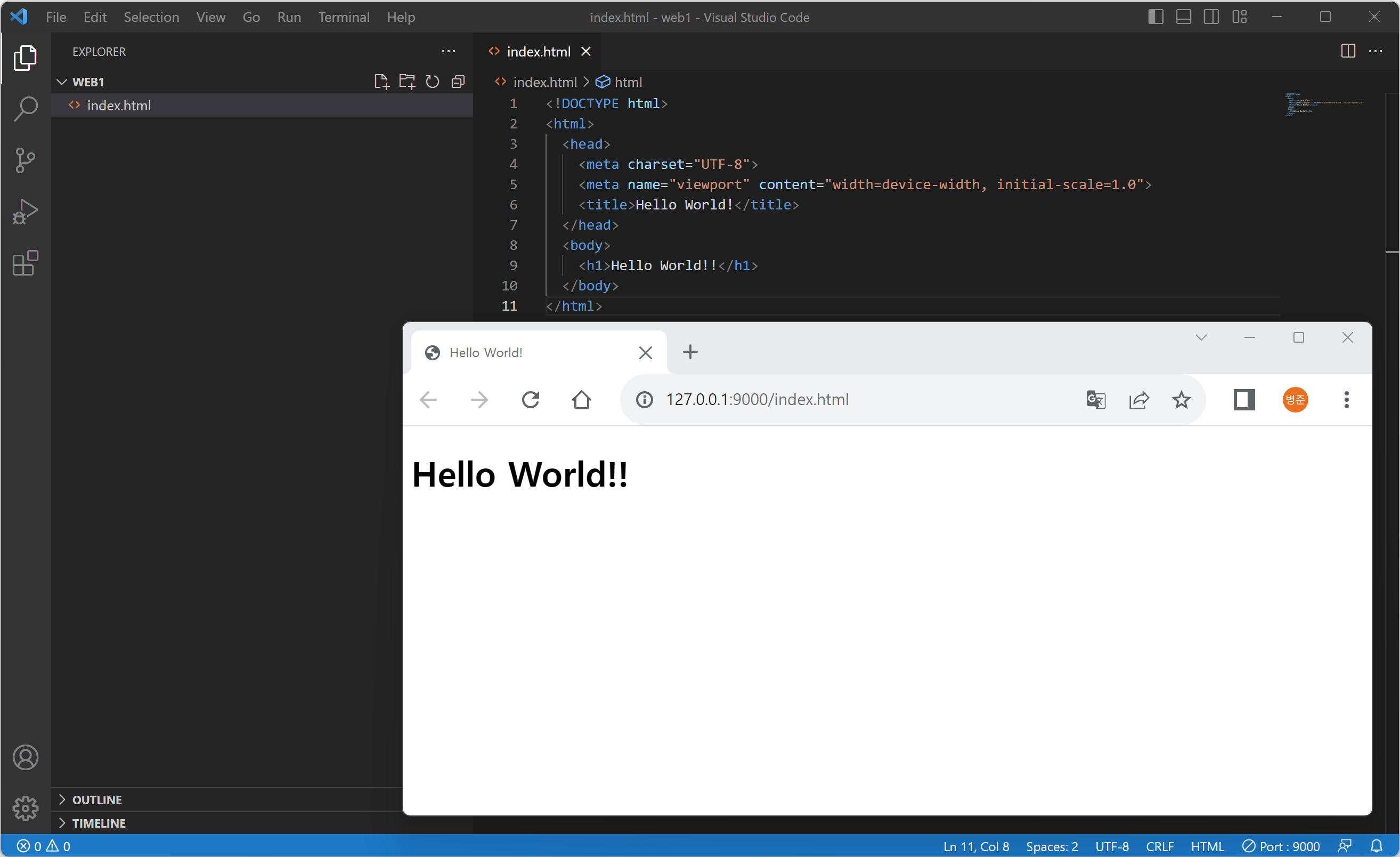 4. index.html 파일을 수정하고 저장하면 바로 실행된 웹 브라우저에 반영이 됩니다.