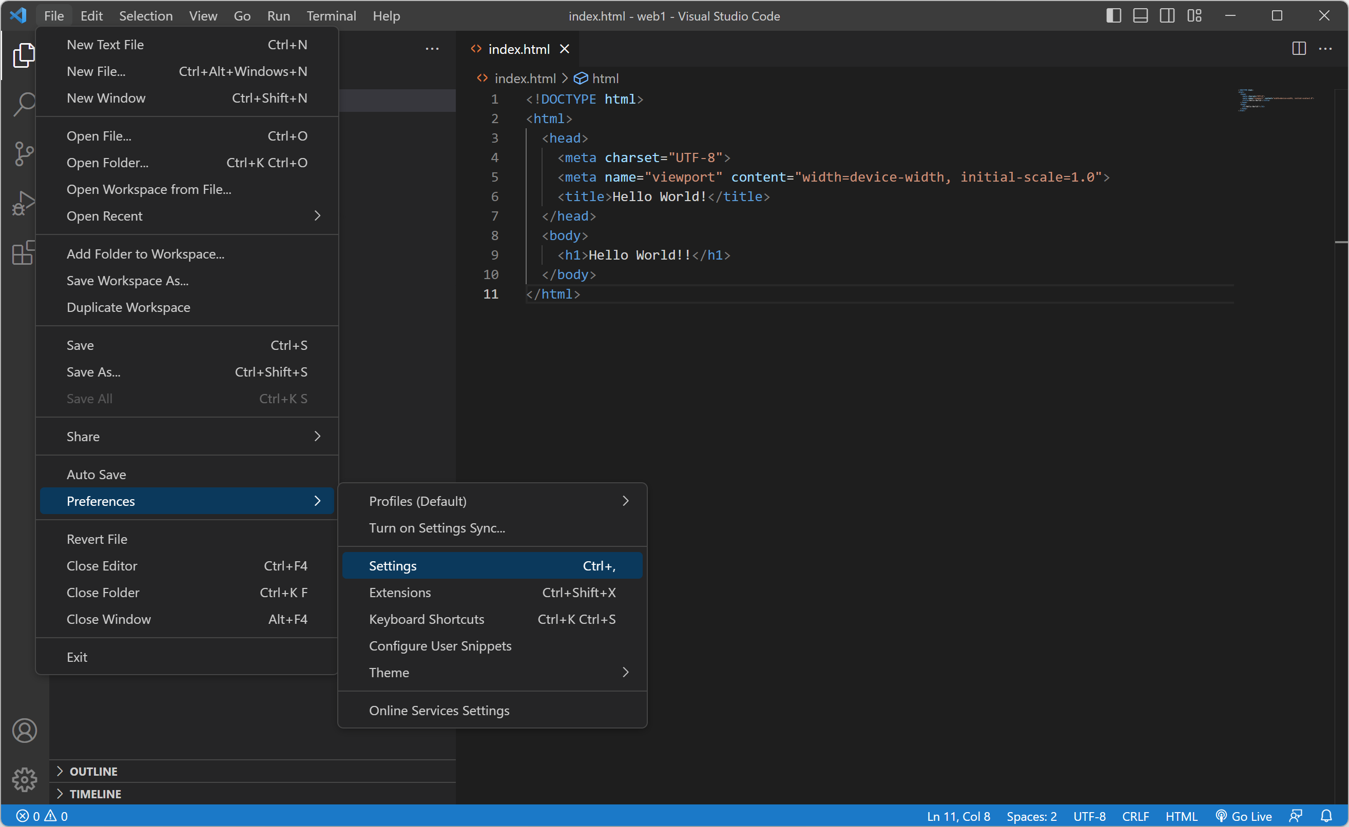 "Go Live"를 클릭하면 현재 편집기의 파일이 Live Server로 실행됩니다.