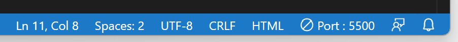Live Server가 실행되면 Status Bar(상태 표시줄)에 설정된 포트번호("Port : 5500")로 표시됩니다.