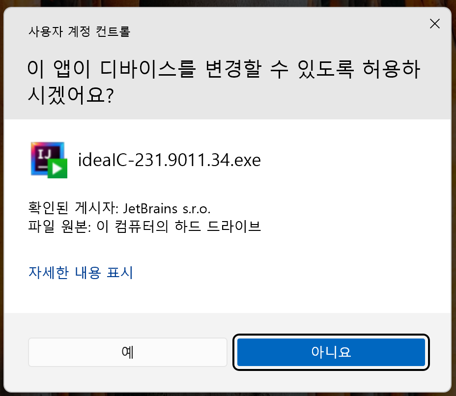 1. 웹 브라우저 하단에 있는 다운로드된 파일을 클릭하거나 다운로드 폴더에서 다운로드 ideaIC-2023.1.2.exe 파일을 클릭합니다. 그러면 "이 앱이 디바이스를 변경할 수 있도록 허용하시겠어요?"라는 보안 확인 창이 나타납니다. "예" 버튼을 클릭합니다.