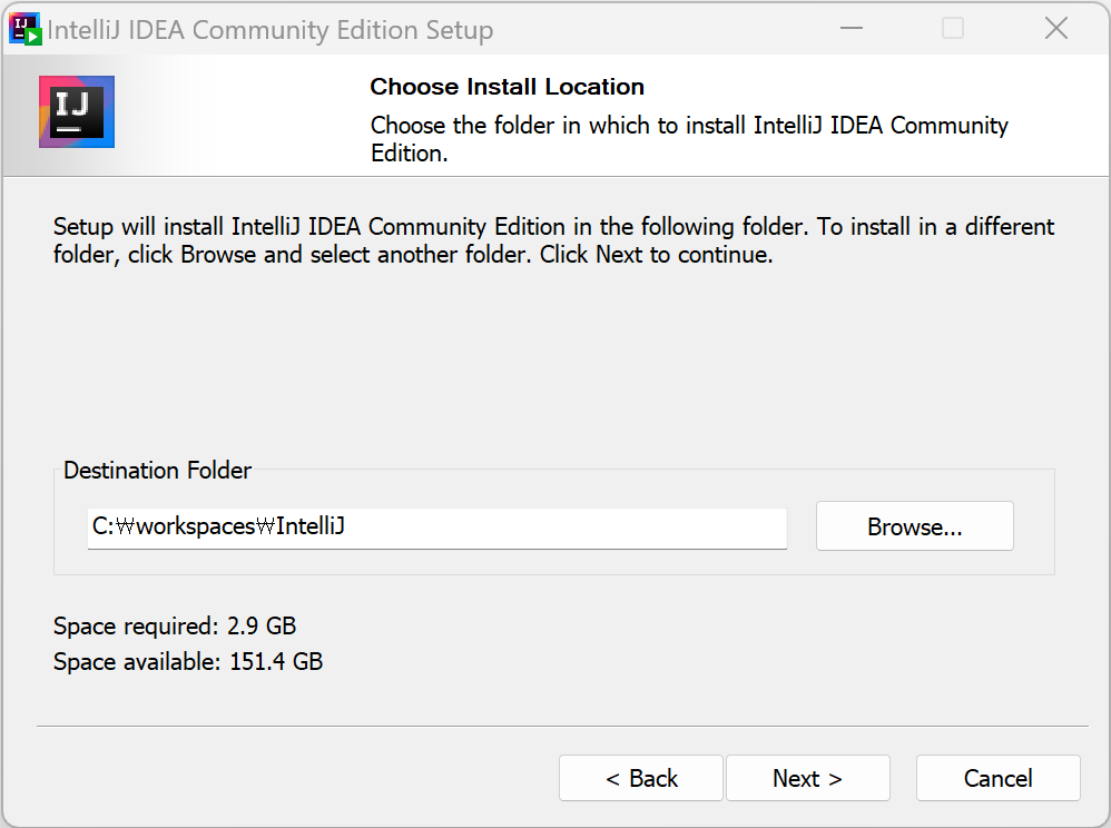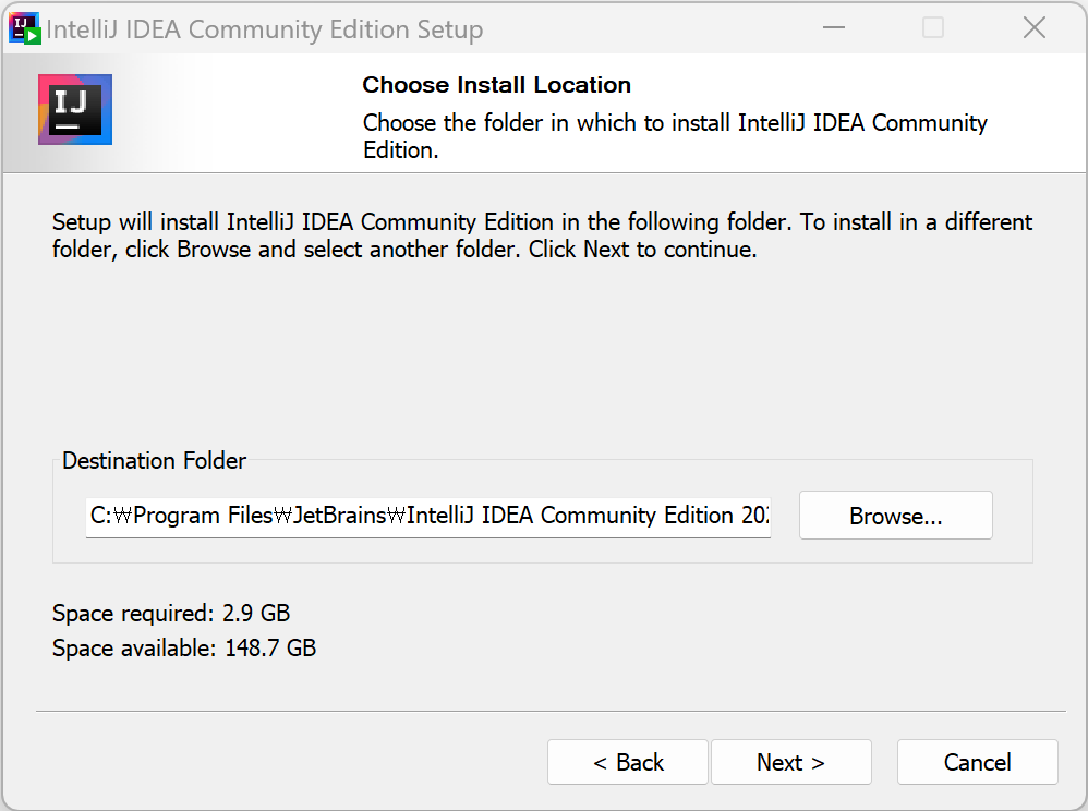 기본적으로 "C:\Program Files\JetBrains\IntelliJ IDEA Community Edition 2023.1.2"로 되어 있습니다.