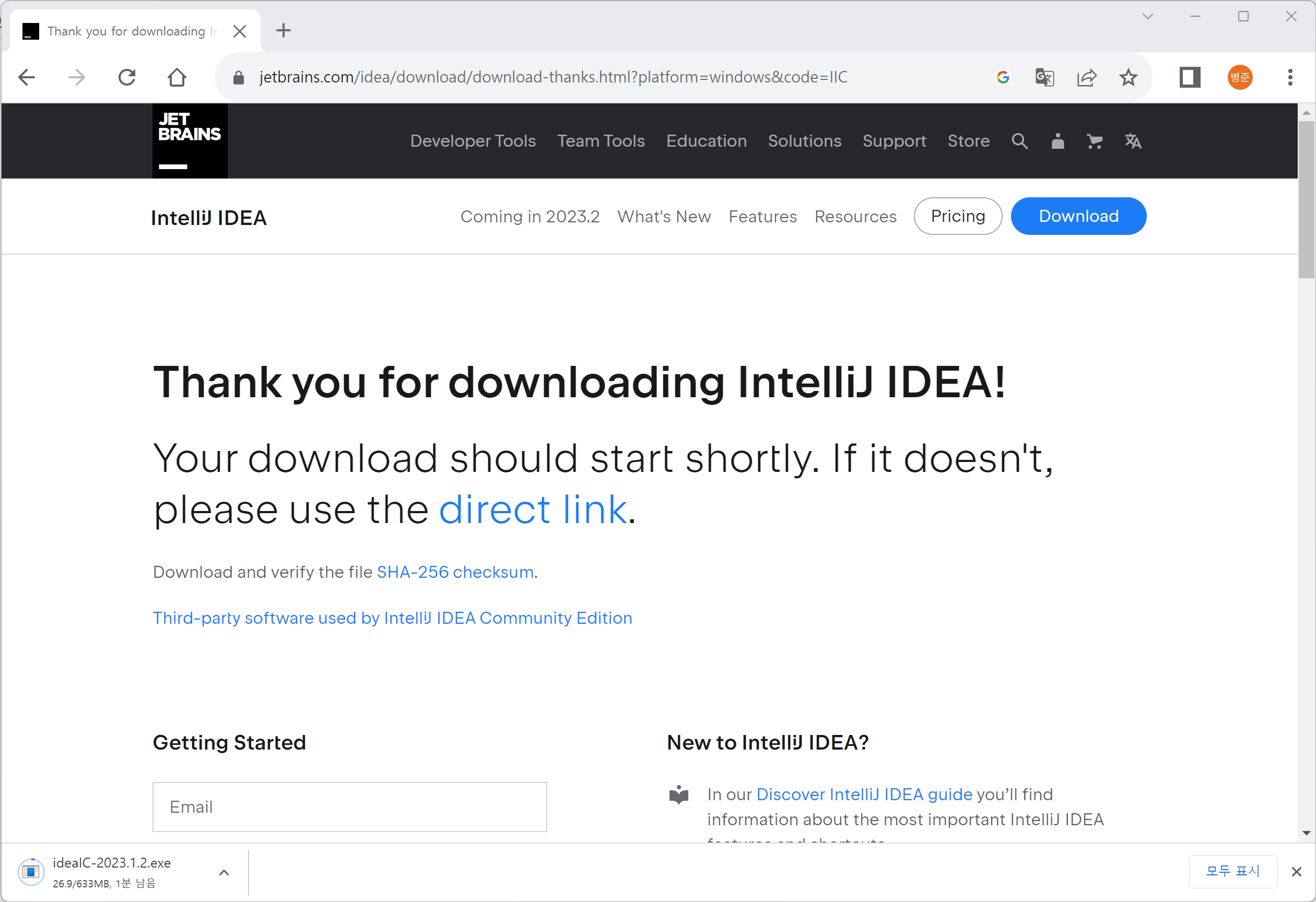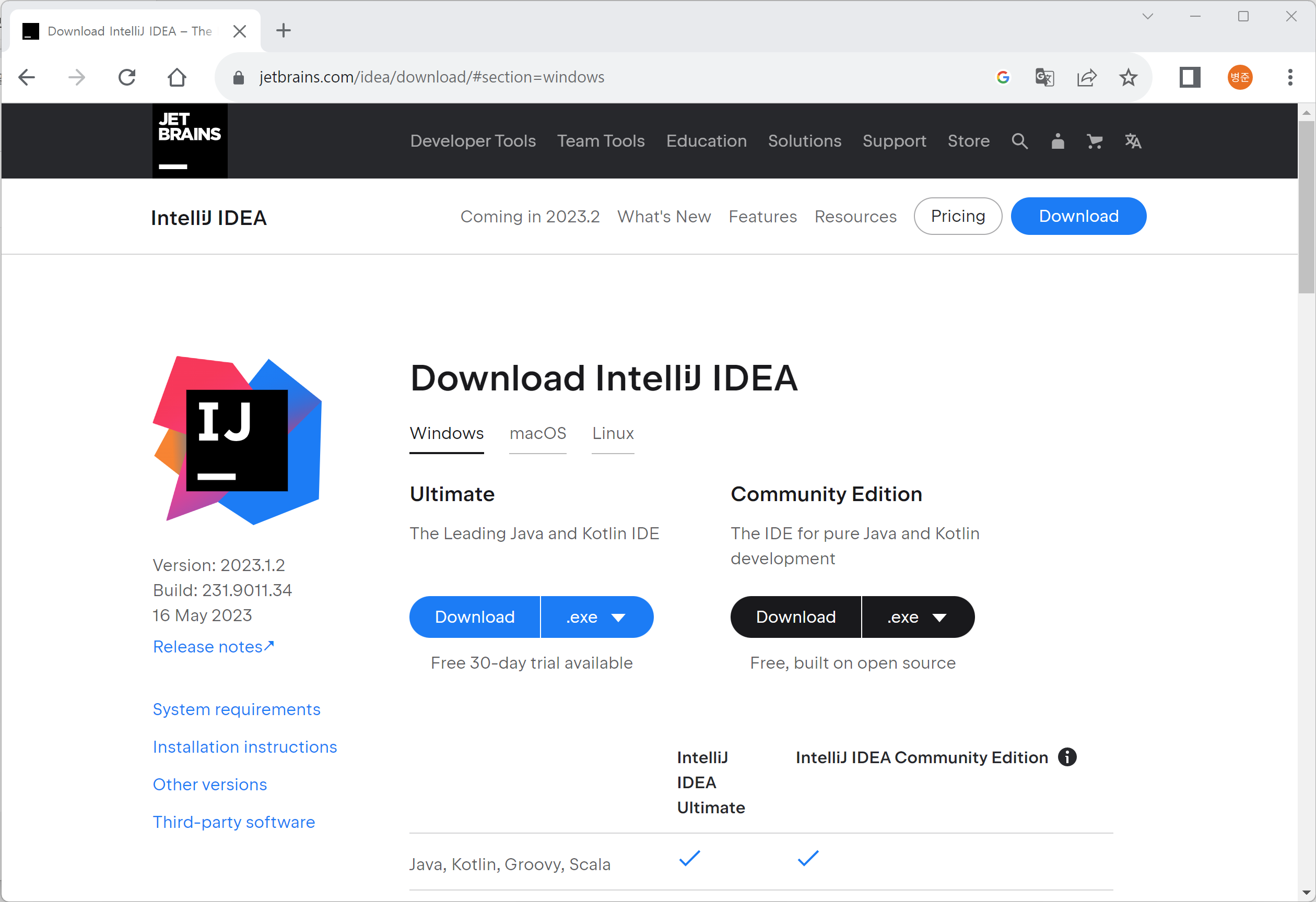 3. 여기서는 무료버전인 Communiry Edition을 다운로드하겠습니다. Communiry Edition에 있는 Download버튼을 클릭하면 감사페이지로 이동되고 IntelliJ 설치 파일(ideaIC-2023.1.2.exe)이 다운로드됩니다.