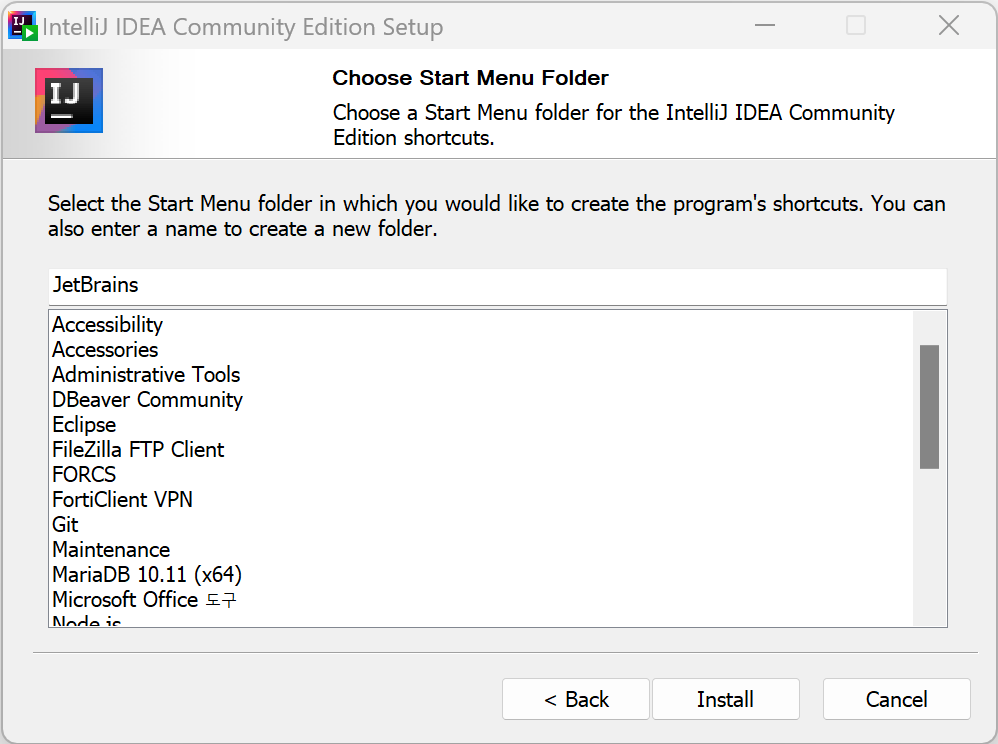 4. 시작 메뉴 폴더명을 입력합니다. 그리고 "Install" 버튼을 누릅니다.