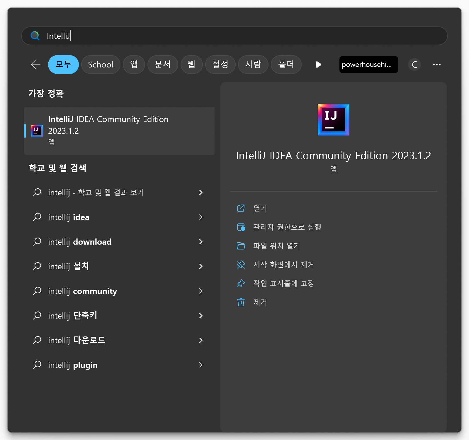 또는 윈도우 시작 버튼을 클릭하고 "IntelliJ"를 입력하고 IntelliJ IDEA Community Edition 2023.1.2 앱을 클릭합니다.