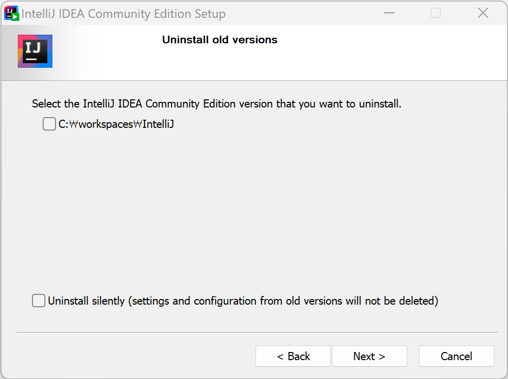 이전에 IntelliJ IDEA를 설치하였다면 이전 버전을 삭제할지 물어봅니다.