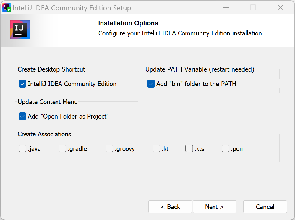 3. 설치 옵션(바탕화면에 바로가기를 생성, 시스템 환경 변수의 PATH에 IntelliJ의 "bin" 폴더 경로 추가, 콘텍스트 메뉴에 추가)을 선택합니다. 그리고 "Next >" 버튼을 누릅니다.