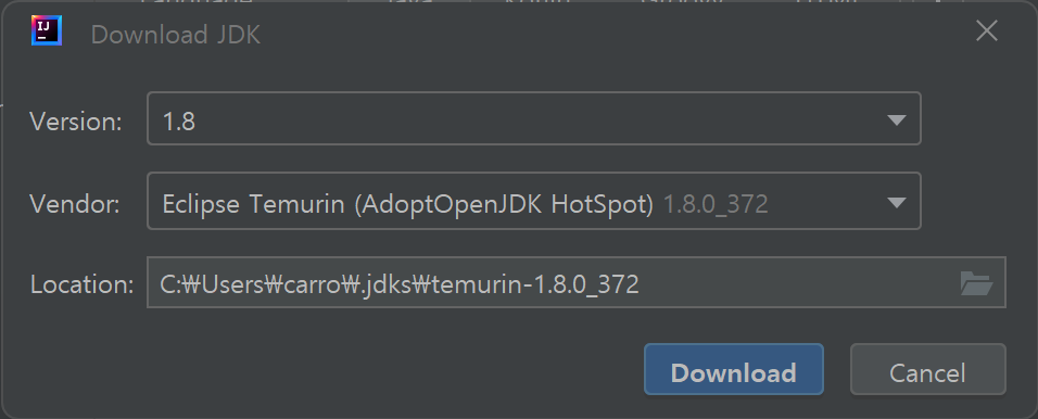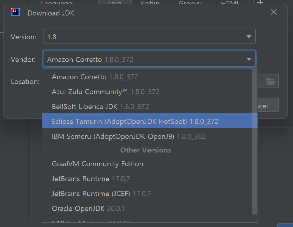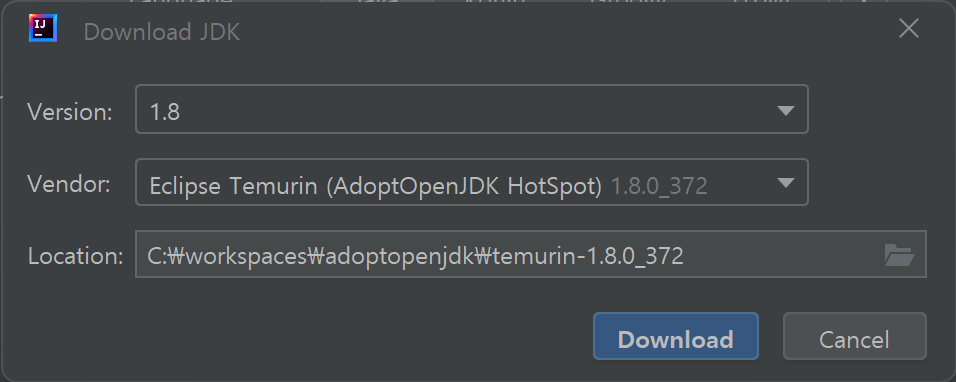 저는 "Location"를 "C:\workspaces\adoptopenjdk\temurin-1.8.0_372"로 변경하였습니다.