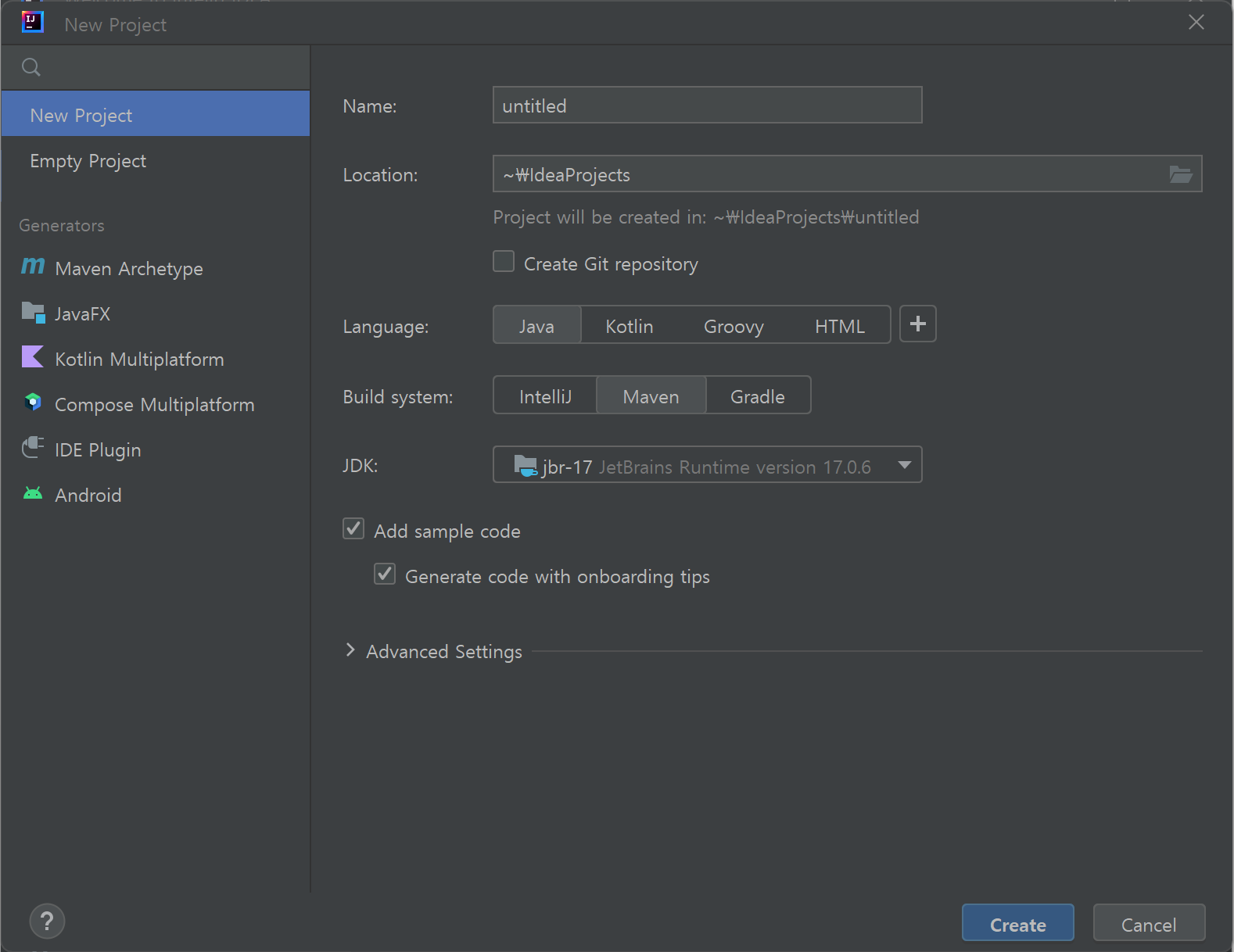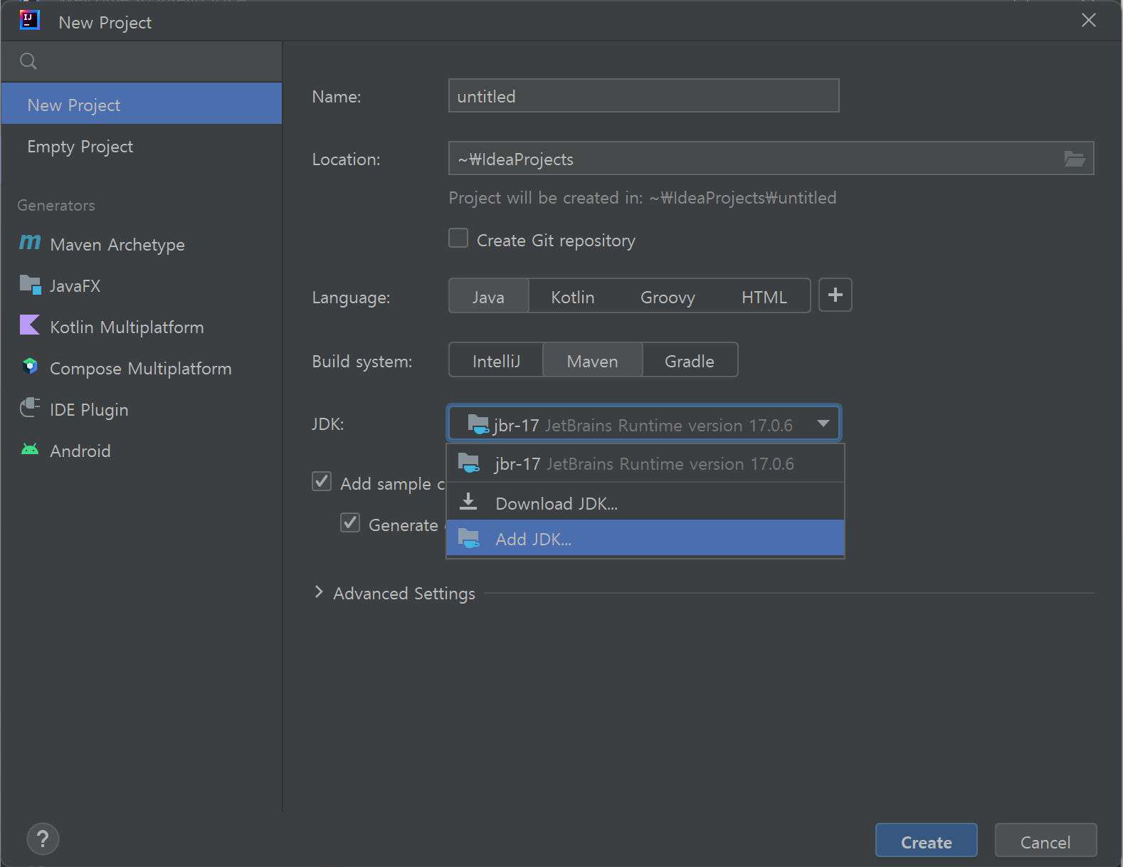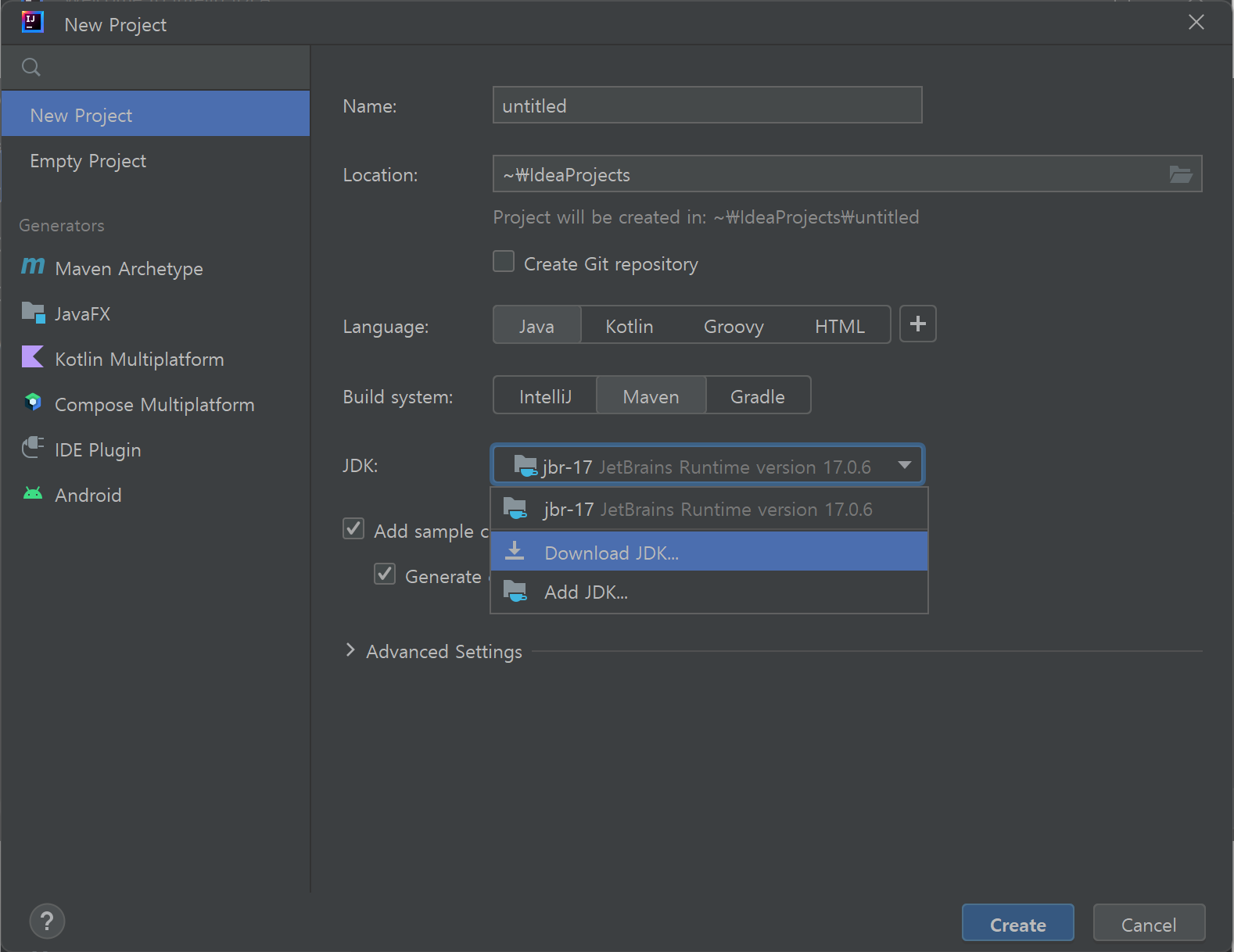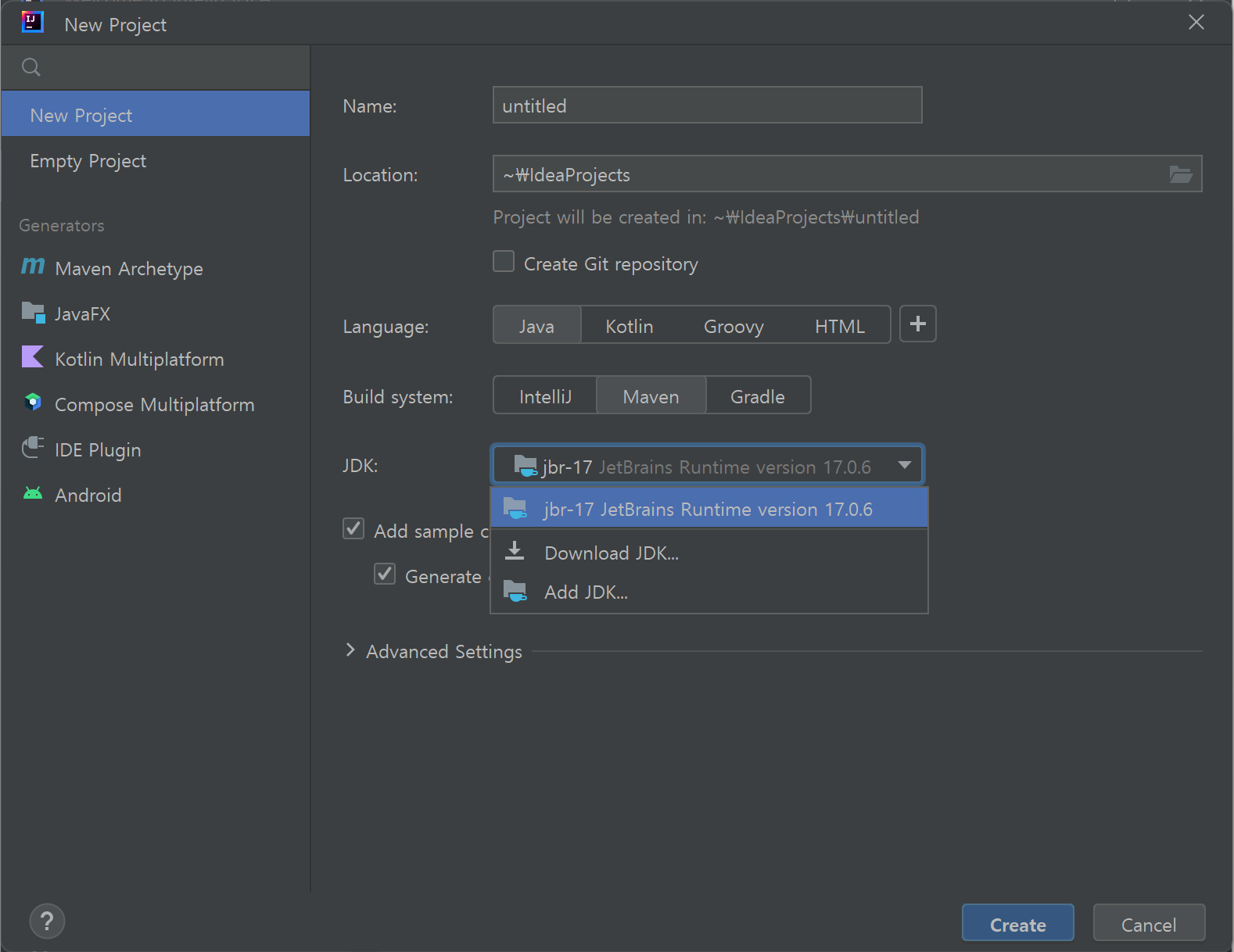 "New Project" 대화상자에서 "JDK"를 보면 "JetBrains Runtime version 17.0.6"인 것을 확인할 수 있습니다.