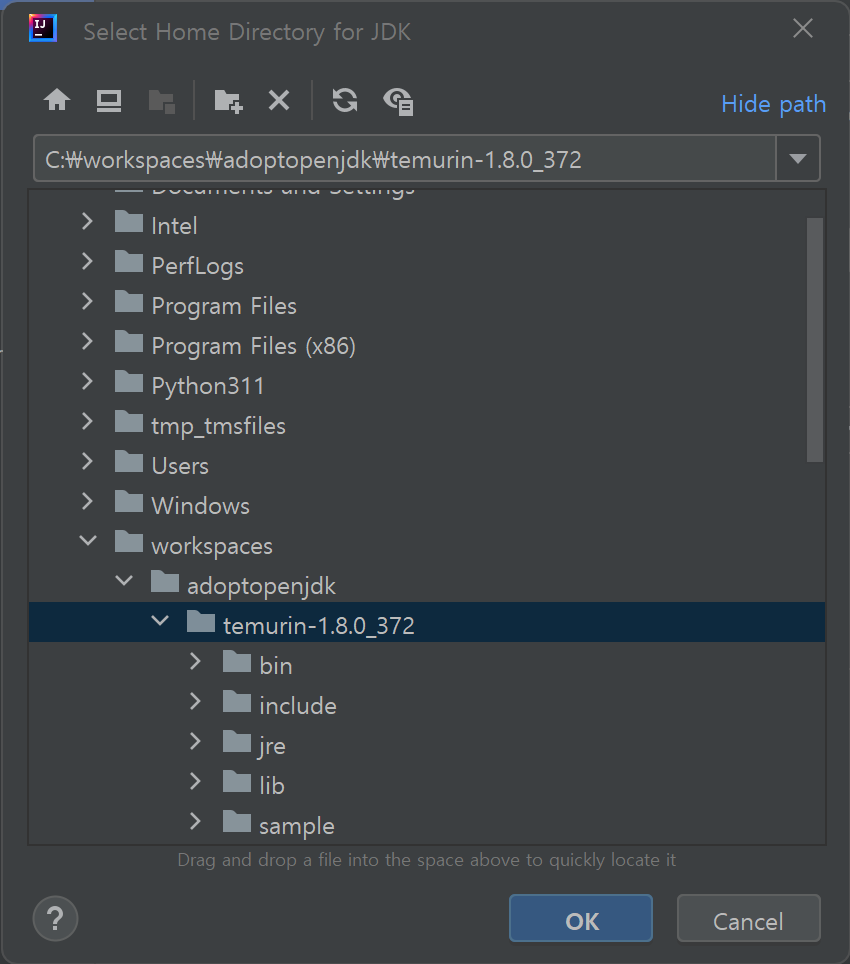 그러면 JDK의 홈 디렉터리를 선택하는 대화상자가 나타납니다. JDK가 다운로드된 폴더를 선택하고 "OK" 버튼을 누릅니다. 저는 "C:\workspaces\adoptopenjdk\temurin-1.8.0_372" 폴더에 선택하였습니다.