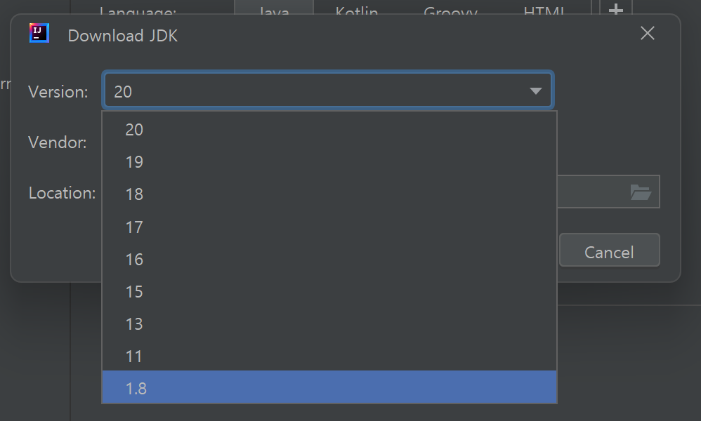 3. "Download JDK" 대화상자에서 "Version"의 셀렉트박스를 클릭하여 "1.8"를 선택합니다.