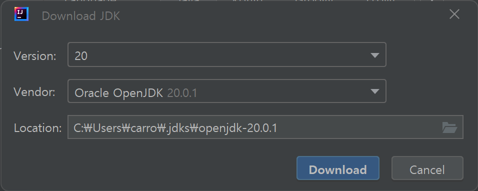 2. "JDK"의 셀렉트박스를 클릭하여 "Download JDK..."를 선택합니다.