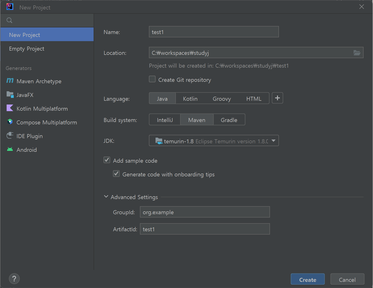 2. New Project 대화상자에서 프로젝트 이름(Name)을 입력하고 프로젝트 경로(Location), 개발언어(Language), 빌드 시스템(Build system), JDK를 선택하고 "Create" 버튼을 누릅니다.