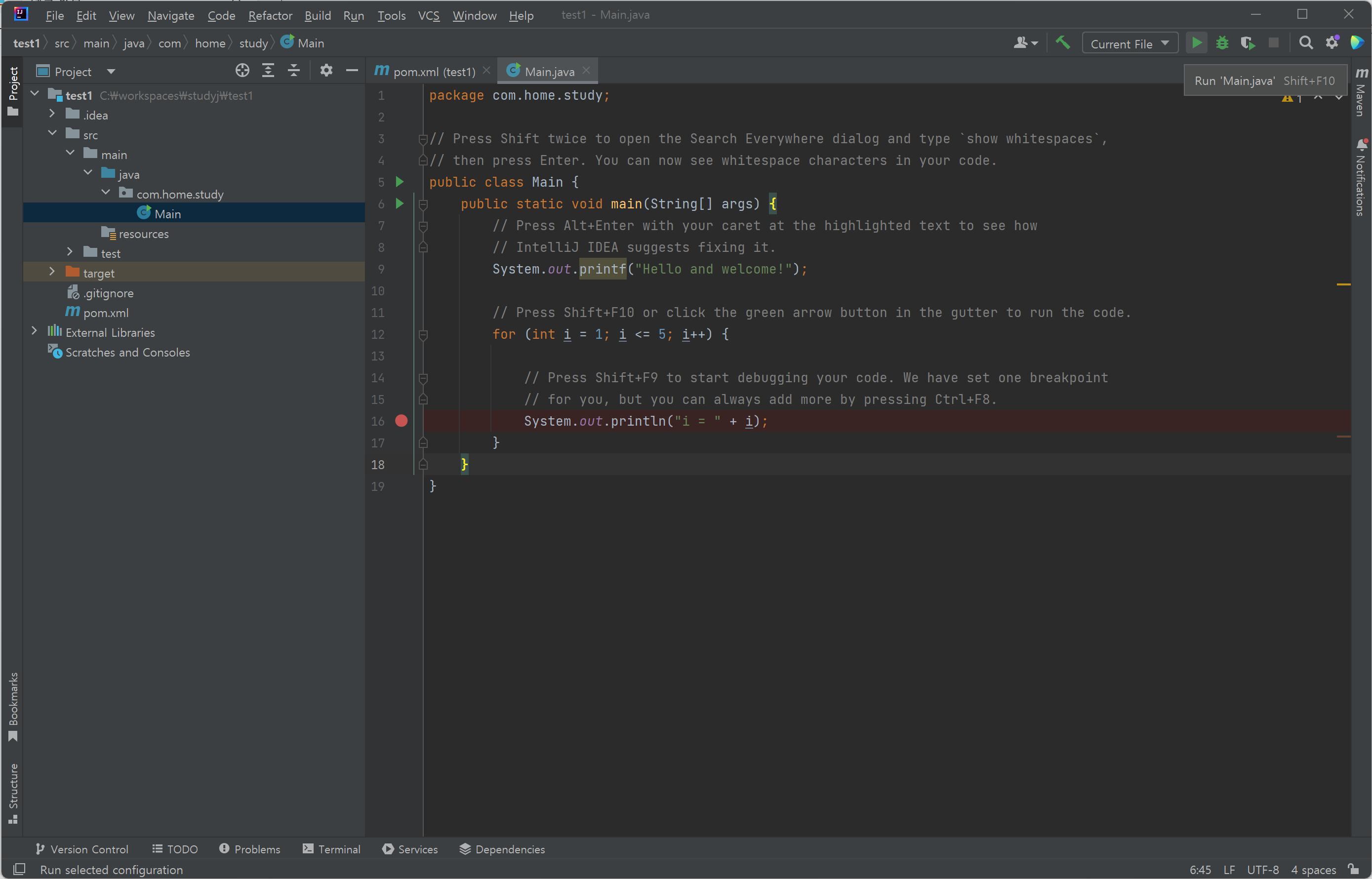 또는 상단 툴바(Toolbar)에서 녹색 실행(Run)을 누릅니다.