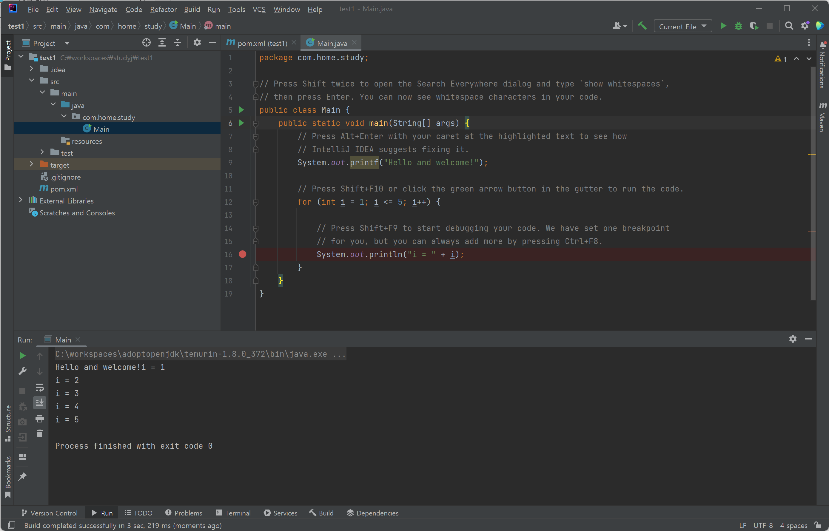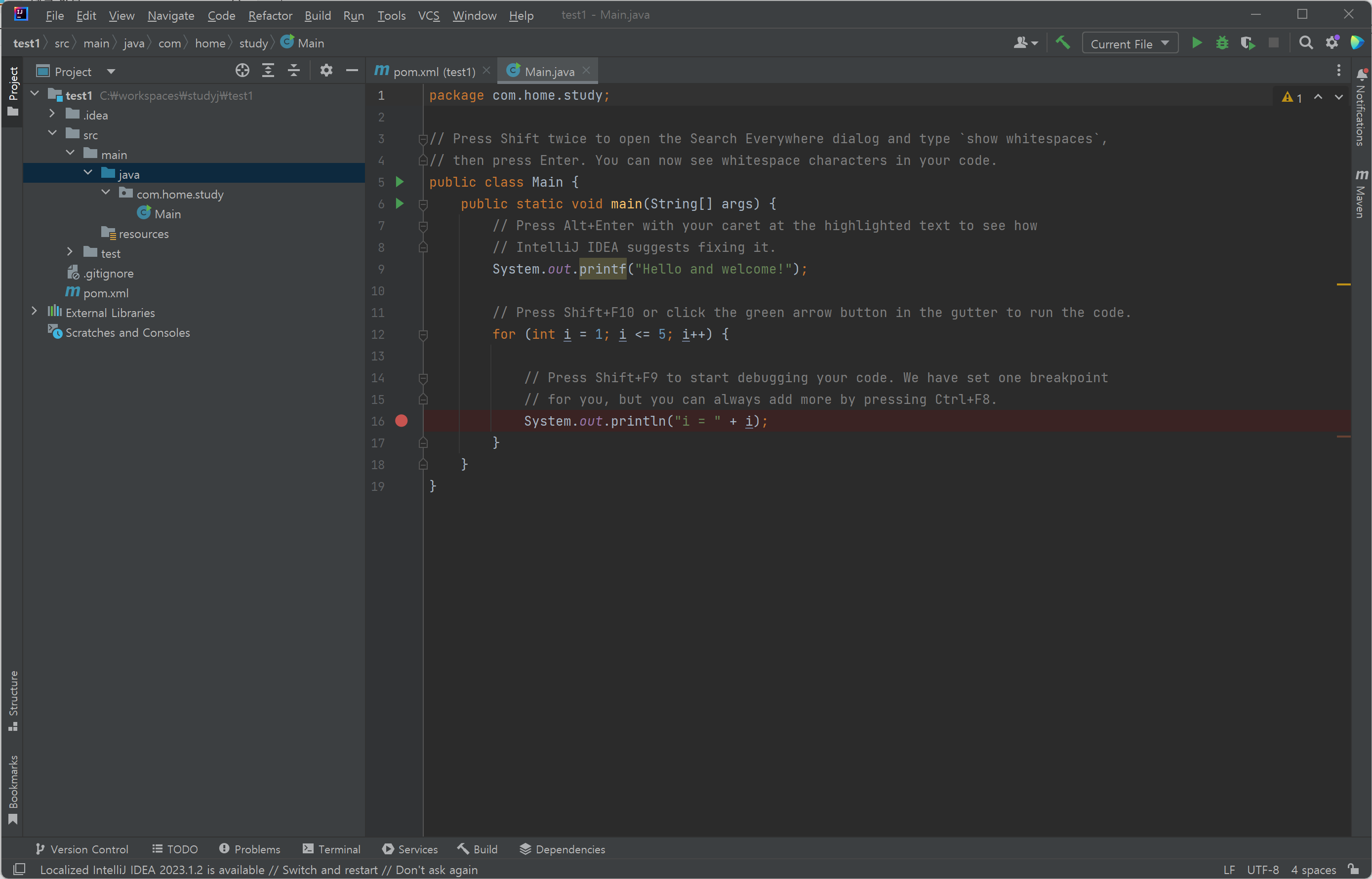 샘플 코드에서 "Hello and welcome!"의 출력문으로 System.out.printf 보다는 System.out.println으로 하는 게 맞는 것 같습니다.